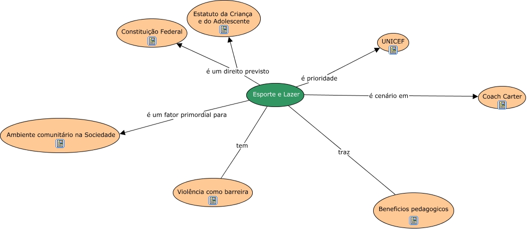 Esse mapa conceitual, produzido no IHMC CmapTools, tem a informação relacionada a: MC Esporte, lazer e violência, Esporte e Lazer é cenário em Coach Carter, Esporte e Lazer traz Beneficios pedagogicos, Esporte e Lazer é prioridade UNICEF, Esporte e Lazer tem Violência como barreira, Esporte e Lazer é um direito previsto Constituição Federal, Esporte e Lazer é um direito previsto Estatuto da Criança e do Adolescente, Esporte e Lazer é um fator primordial para Ambiente comunitário na Sociedade
