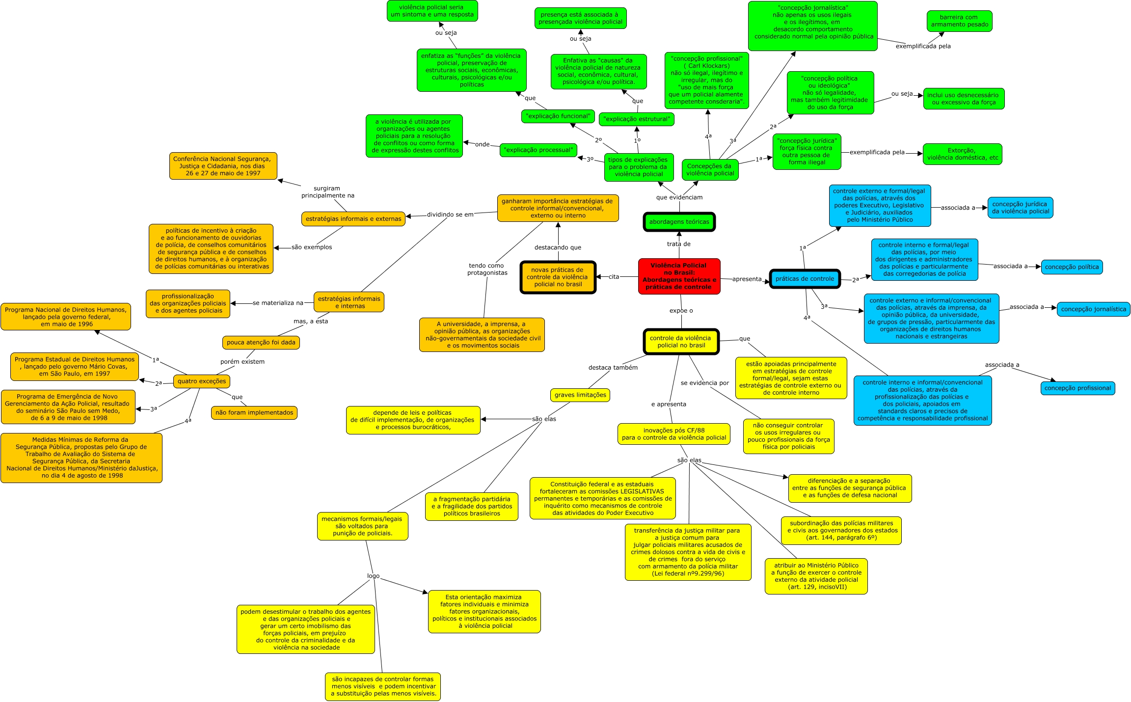 Este Cmap, tiene información relacionada con: Violência policial no Brasil- abordagens teóricas e práticas de controle, inovações pós CF/88 para o controle da violência policial são elas transferência da justiça militar para a justiça comum para julgar policiais militares acusados de crimes dolosos contra a vida de civis e de crimes fora do serviço com armamento da polícia militar (Lei federal nº9.299/96), controle externo e formal/legal das polícias, através dos poderes Executivo, Legislativo e Judiciário, auxiliados pelo Ministério Público associada a concepção jurídica da violência policial, "explicação estrutural" que Enfativa as "causas" da violência policial de natureza social, econômica, cultural, psicológica e/ou política., "concepção jornalística" não apenas os usos ilegais e os ilegítimos, em desacordo comportamento considerado normal pela opinião pública exemplificada pela barreira com armamento pesado, práticas de controle 2ª controle interno e formal/legal das polícias, por meio dos dirigentes e administradores das polícias e particularmente das corregedorias de polícia, controle interno e formal/legal das polícias, por meio dos dirigentes e administradores das polícias e particularmente das corregedorias de polícia associada a concepção política, Violência Policial no Brasil: Abordagens teóricas e práticas de controle trata de abordagens teóricas, tipos de explicações para o problema da violência policial 2º "explicação funcional", graves limitações são elas mecanismos formais/legais são voltados para punição de policiais., controle da violência policial no brasil que estão apoiadas principalmente em estratégias de controle formal/legal, sejam estas estratégias de controle externo ou de controle interno, inovações pós CF/88 para o controle da violência policial são elas subordinação das polícias militares e civis aos governadores dos estados (art. 144, parágrafo 6º), controle interno e informal/convencional das polícias, através da profissionalização das polícias e dos policiais, apoiados em standards claros e precisos de competência e responsabilidade profissional associada a concepção profissional, ganharam importância estratégias de controle informal/convencional, externo ou interno dividindo se em estratégias informais e internas, controle da violência policial no brasil destaca também graves limitações, novas práticas de controle da violência policial no brasil destacando que ganharam importância estratégias de controle informal/convencional, externo ou interno, quatro exceções 3ª Programa de Emergência de Novo Gerenciamento da Ação Policial, resultado do seminário São Paulo sem Medo, de 6 a 9 de maio de 1998, práticas de controle 3ª controle externo e informal/convencional das polícias, através da imprensa, da opinião pública, da universidade, de grupos de pressão, particularmente das organizações de direitos humanos nacionais e estrangeiras, inovações pós CF/88 para o controle da violência policial são elas atribuir ao Ministério Público a função de exercer o controle externo da atividade policial (art. 129, incisoVII), quatro exceções 1ª Programa Nacional de Direitos Humanos, lançado pela governo federal, em maio de 1996, "concepção jurídica" força física contra outra pessoa de forma iliegal exemplificada pela Extorção, violência doméstica, etc
