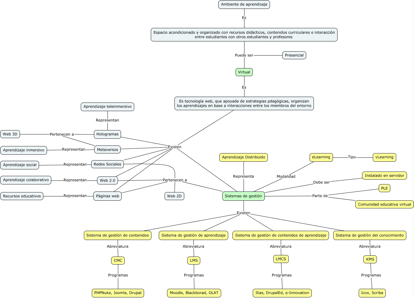 Este Cmap, tiene información relacionada con: Ambiente virtual de aprendizaje, Es tecnologìa web, que apoyada de estrategias pdagògicas, organizan los aprendizajes en base a interacciones entre los miembros del entorno Existen Pàginas web, Espacio acondicionado y organizado con recursos didàcticos, contenidos curriculares e interacciòn entre estudiantes con otros estudiantes y profesores Puede ser Presencial, Sistemas de gestiòn Parte de PLE, LMS Programas Moodle, Blackborad, OLAT, Sistemas de gestiòn Representa Aprendizaje Distribuido, LMS Abreviatura Sistema de gestiòn de aprendizaje, Sistemas de gestiòn Parte de Comunidad educativa virtual, Sistemas de gestiòn Existen Sistema de gestiòn de contenidos, Aprendizaje inmersivo Representan Metaversos, CMC Programas PHPNuke, Joomla, Drupal, Web 2D Pertenecen a Redes Sociales, Es tecnologìa web, que apoyada de estrategias pdagògicas, organizan los aprendizajes en base a interacciones entre los miembros del entorno Existen Sistemas de gestiòn, Espacio acondicionado y organizado con recursos didàcticos, contenidos curriculares e interacciòn entre estudiantes con otros estudiantes y profesores Puede ser Virtual, LMCS Programas Ilias, DrupalEd, e-Innovation, Web 2.0 Representan Aprendizaje colaborativo, Es tecnologìa web, que apoyada de estrategias pdagògicas, organizan los aprendizajes en base a interacciones entre los miembros del entorno Existen Web 2.0, Web 2D Pertenecen a Web 2.0, KMS Abreviatura Sistema de gestiòn del conocimiento, Web 2D Pertenecen a Pàginas web, Virtual Es Es tecnologìa web, que apoyada de estrategias pdagògicas, organizan los aprendizajes en base a interacciones entre los miembros del entorno