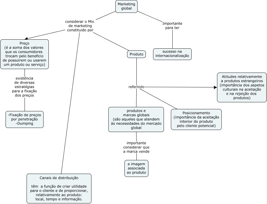 Esse mapa conceitual, produzido no IHMC CmapTools, tem a informação relacionada a: marketing_1, Preço (é a soma dos valores que os consumidores trocam pelo beneficio de possuirem ou usarem um produto ou serviço) existência de diversas estratégias para a fixação dos preços -Fixação de preços por penetração -Dumping, Marketing global considerar o Mix de marketing constituido por Preço (é a soma dos valores que os consumidores trocam pelo beneficio de possuirem ou usarem um produto ou serviço), Marketing global Importante para ter sucesso na internacionalização, produtos e marcas globais (são aqueles que atendem às necessidades do mercado global importante considerar que a marca vende a imagem associada ao produto, Produto referindo Posicionamento (importância da aceitação interior do produto pelo cliente potencial), Produto referindo produtos e marcas globais (são aqueles que atendem às necessidades do mercado global, Marketing global considerar o Mix de marketing constituido por Produto, Marketing global considerar o Mix de marketing constituido por Canais de distribuição têm a função de criar utilidade para o cliente e de proporcionar, relativamente ao produto: local, tempo e informação., Produto referindo Atitudes relativamente a produtos estrangeiros (importância dos aspetos culturais na aceitação e na rejeição dos produtos)