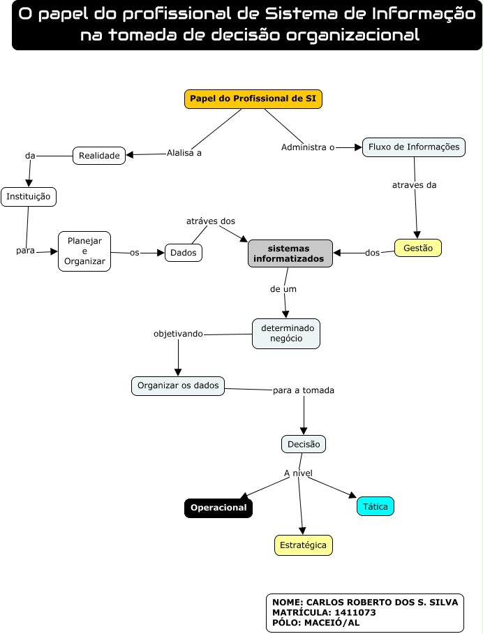 Esse mapa conceitual, produzido no IHMC CmapTools, tem a informação relacionada a: 1a.semana01-atividade01, Organizar os dados para a tomada Decisão, Papel do Profissional de SI Alalisa a Realidade, Decisão A nível Estratégica, sistemas informatizados de um determinado negócio, Instituição para Planejar e Organizar, Fluxo de Informações atraves da Gestão, Decisão A nível Operacional, Realidade da Instituição, Dados atráves dos sistemas informatizados, determinado negócio objetivando Organizar os dados, Planejar e Organizar os Dados, Gestão dos sistemas informatizados, Decisão A nível Tática, Papel do Profissional de SI Administra o Fluxo de Informações
