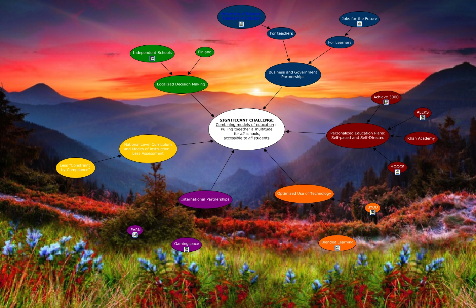 Este Cmap, tiene información relacionada con: Significant Challenge Competing Models of Education, MOOCS Perzonalized Education Plans: Self-paced and Self-Directed, For Learners Business and Government Partnerships, Optimized Use of Technology SIGNIFICANT CHALLENGE Combining models of education: Pulling together a multitude for allschools, accessible to allstudents, Business and Government Partnerships SIGNIFICANT CHALLENGE Combining models of education: Pulling together a multitude for allschools, accessible to allstudents, Jobs for the Future For Learners, Khan Academy Perzonalized Education Plans: Self-paced and Self-Directed, Finland Localized Decision Making, National Level Curriculum and Modes of instruction, Less Assessment SIGNIFICANT CHALLENGE Combining models of education: Pulling together a multitude for allschools, accessible to allstudents, Independent Schools Localized Decision Making, Less "Constraint by Compliance" National Level Curriculum and Modes of instruction, Less Assessment, iEARN International Partnerships, Perzonalized Education Plans: Self-paced and Self-Directed SIGNIFICANT CHALLENGE Combining models of education: Pulling together a multitude for allschools, accessible to allstudents, For teachers Business and Government Partnerships, Localized Decision Making SIGNIFICANT CHALLENGE Combining models of education: Pulling together a multitude for allschools, accessible to allstudents, ALEKS Perzonalized Education Plans: Self-paced and Self-Directed, International Partnerships SIGNIFICANT CHALLENGE Combining models of education: Pulling together a multitude for allschools, accessible to allstudents, Gamingspace International Partnerships, University of Arizona: Teachers in Industry For teachers, Blended Learning Optimized Use of Technology, BYOD Optimized Use of Technology