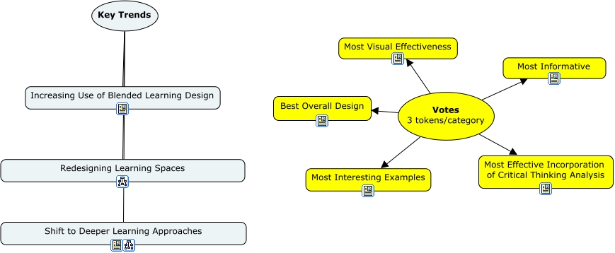 This Concept Map, created with IHMC CmapTools, has information related to: KEY TRENDS, Votes 3 tokens/category Most Interesting Examples, Votes 3 tokens/category Most Effective Incorporation of Critical Thinking Analysis, Key Trends Increasing Use of Blended Learning Design, Votes 3 tokens/category Most Informative, Votes 3 tokens/category Best Overall Design, Key Trends Shift to Deeper Learning Approaches, Votes 3 tokens/category Most Visual Effectiveness, Key Trends Redesigning Learning Spaces