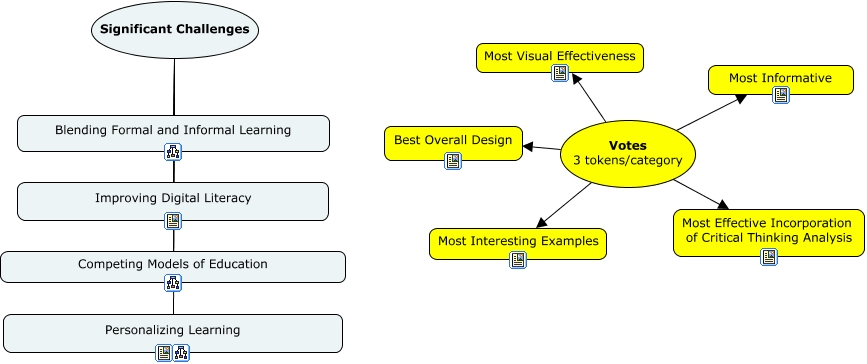 This Concept Map, created with IHMC CmapTools, has information related to: SIGNIFICANT CHALLENGES, Votes 3 tokens/category Best Overall Design, Significant Challenges Improving Digital Literacy, Votes 3 tokens/category Most Effective Incorporation of Critical Thinking Analysis, Significant Challenges Personalizing Learning, Votes 3 tokens/category Most Informative, Significant Challenges Competing Models of Education, Significant Challenges Blending Formal and Informal Learning, Votes 3 tokens/category Most Visual Effectiveness, Votes 3 tokens/category Most Interesting Examples