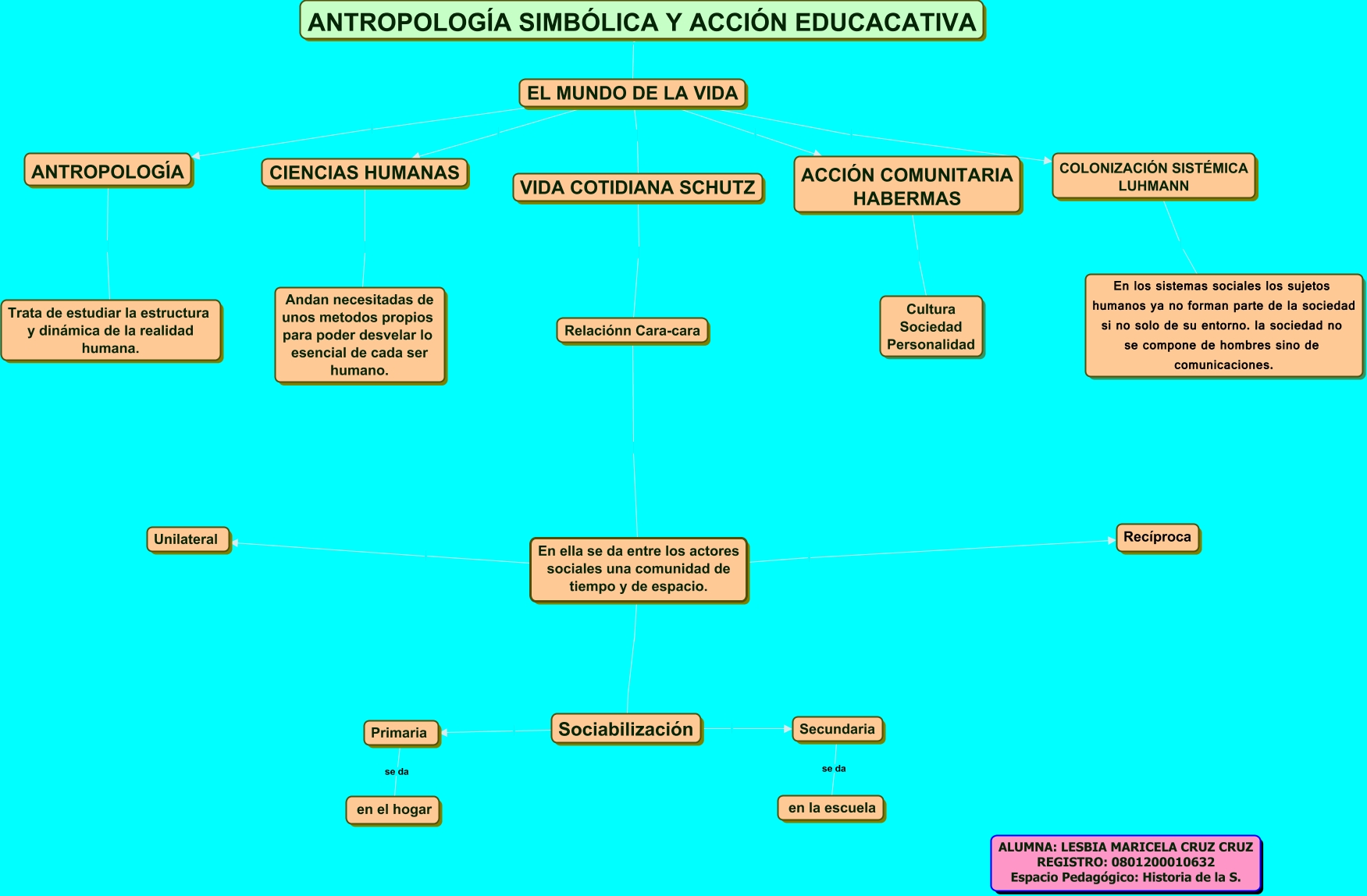 Este Cmap, tiene información relacionada con: max, Sociabilización Primaria, Sociabilización Secundaria, Secundaria se da en la escuela, ACCIÓN COMUNITARIA HABERMAS Cultura Sociedad Personalidad, VIDA COTIDIANA SCHUTZ Relaciónn Cara-cara, EL MUNDO DE LA VIDA ANTROPOLOGÍA, Primaria se da en el hogar, En ella se da entre los actores sociales una comunidad de tiempo y de espacio. Unilateral, EL MUNDO DE LA VIDA VIDA COTIDIANA SCHUTZ, EL MUNDO DE LA VIDA ANTROPOLOGÍA SIMBÓLICA Y ACCIÓN EDUCACATIVA, EL MUNDO DE LA VIDA COLONIZACIÓN SISTÉMICA LUHMANN, CIENCIAS HUMANAS Andan necesitadas de unos metodos propios para poder desvelar lo esencial de cada ser humano., Relaciónn Cara-cara En ella se da entre los actores sociales una comunidad de tiempo y de espacio., COLONIZACIÓN SISTÉMICA LUHMANN En los sistemas sociales los sujetos humanos ya no forman parte de la sociedad si no solo de su entorno. la sociedad no se compone de hombres sino de comunicaciones., EL MUNDO DE LA VIDA CIENCIAS HUMANAS, En ella se da entre los actores sociales una comunidad de tiempo y de espacio. Recíproca, En ella se da entre los actores sociales una comunidad de tiempo y de espacio. Sociabilización, EL MUNDO DE LA VIDA ACCIÓN COMUNITARIA HABERMAS, ANTROPOLOGÍA Trata de estudiar la estructura y dinámica de la realidad humana.