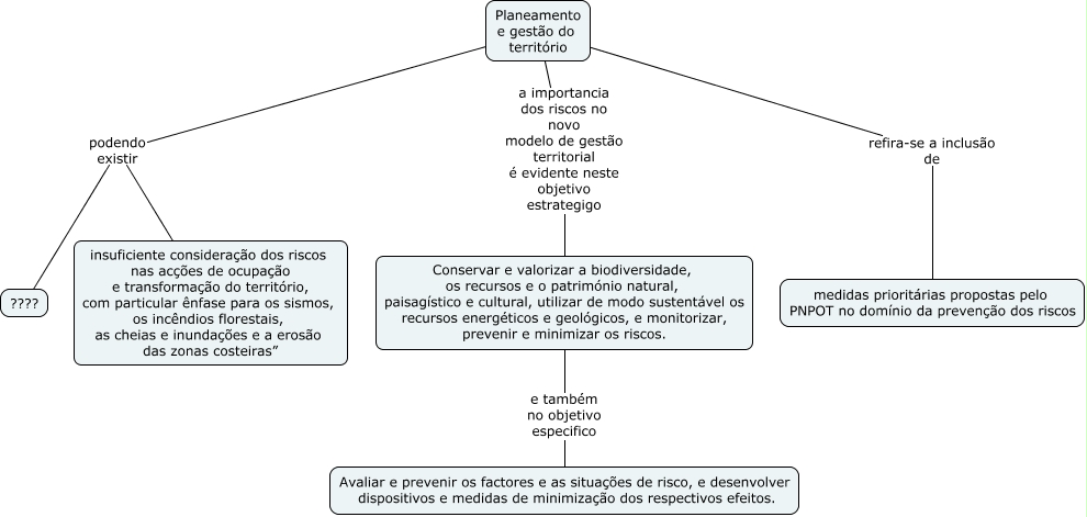 Esse mapa conceitual, produzido no IHMC CmapTools, tem a informação relacionada a: ordenamento território_4c, Planeamento e gestão do território podendo existir ????, Planeamento e gestão do território podendo existir insuficiente consideração dos riscos nas acções de ocupação e transformação do território, com particular ênfase para os sismos, os incêndios florestais, as cheias e inundações e a erosão das zonas costeiras”, Planeamento e gestão do território refira-se a inclusão de medidas prioritárias propostas pelo PNPOT no domínio da prevenção dos riscos, Planeamento e gestão do território a importancia dos riscos no novo modelo de gestão territorial é evidente neste objetivo estrategigo Conservar e valorizar a biodiversidade, os recursos e o património natural, paisagístico e cultural, utilizar de modo sustentável os recursos energéticos e geológicos, e monitorizar, prevenir e minimizar os riscos., Conservar e valorizar a biodiversidade, os recursos e o património natural, paisagístico e cultural, utilizar de modo sustentável os recursos energéticos e geológicos, e monitorizar, prevenir e minimizar os riscos. e também no objetivo especifico Avaliar e prevenir os factores e as situações de risco, e desenvolver dispositivos e medidas de minimização dos respectivos efeitos.
