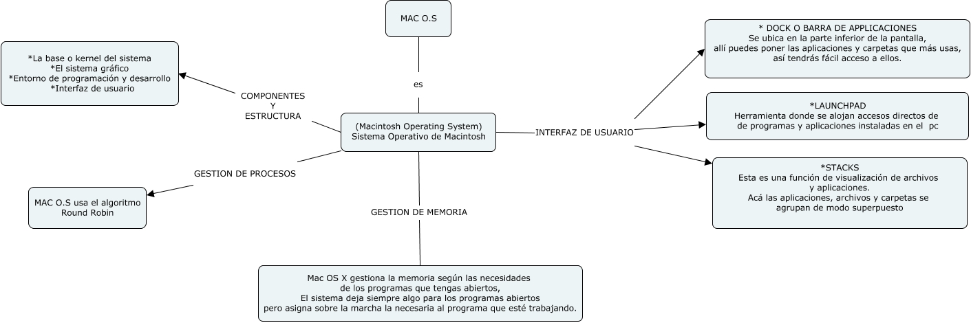 Este Cmap, tiene información relacionada con: MAC OS X, MAC O.S es (Macintosh Operating System) Sistema Operativo de Macintosh, (Macintosh Operating System) Sistema Operativo de Macintosh COMPONENTES Y ESTRUCTURA *La base o kernel del sistema *El sistema gráfico *Entorno de programación y desarrollo *Interfaz de usuario, (Macintosh Operating System) Sistema Operativo de Macintosh GESTION DE MEMORIA Mac OS X gestiona la memoria según las necesidades de los programas que tengas abiertos, El sistema deja siempre algo para los programas abiertos pero asigna sobre la marcha la necesaria al programa que esté trabajando., (Macintosh Operating System) Sistema Operativo de Macintosh GESTION DE PROCESOS MAC O.S usa el algoritmo Round Robin, (Macintosh Operating System) Sistema Operativo de Macintosh INTERFAZ DE USUARIO *STACKS Esta es una función de visualización de archivos y aplicaciones. Acá las aplicaciones, archivos y carpetas se agrupan de modo superpuesto, (Macintosh Operating System) Sistema Operativo de Macintosh INTERFAZ DE USUARIO * DOCK O BARRA DE APPLICACIONES Se ubica en la parte inferior de la pantalla, allí puedes poner las aplicaciones y carpetas que más usas, así tendrás fácil acceso a ellos., (Macintosh Operating System) Sistema Operativo de Macintosh INTERFAZ DE USUARIO *LAUNCHPAD Herramienta donde se alojan accesos directos de de programas y aplicaciones instaladas en el pc
