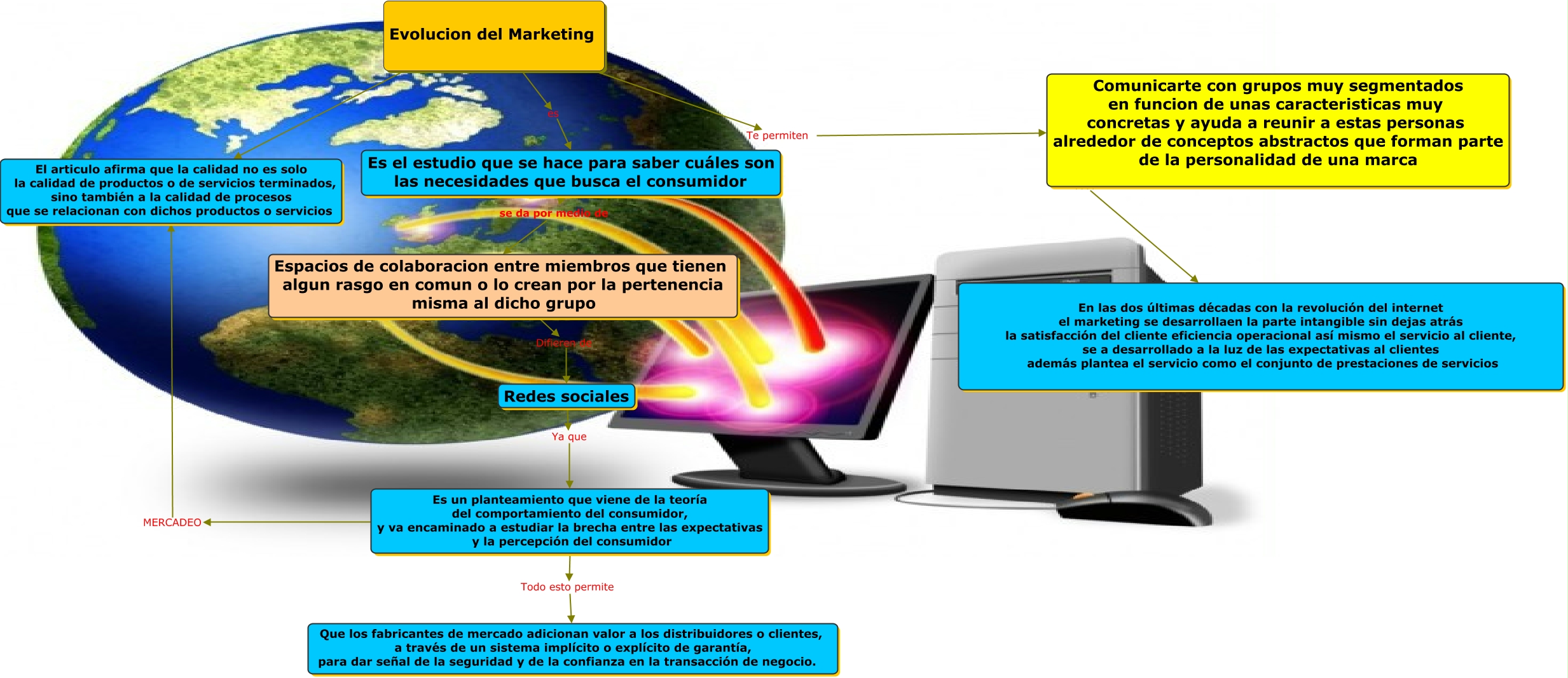 Este Cmap, tiene información relacionada con: la evolucion del interner en el marketing, Espacios de colaboracion entre miembros que tienen algun rasgo en comun o lo crean por la pertenencia misma al dicho grupo Difieren de Redes sociales, Redes sociales Ya que Es un planteamiento que viene de la teoría del comportamiento del consumidor, y va encaminado a estudiar la brecha entre las expectativas y la percepción del consumidor, Evolucion del Marketing es Es el estudio que se hace para saber cuáles son las necesidades que busca el consumidor, Evolucion del Marketing ???? El articulo afirma que la calidad no es solo la calidad de productos o de servicios terminados, sino también a la calidad de procesos que se relacionan con dichos productos o servicios, Es el estudio que se hace para saber cuáles son las necesidades que busca el consumidor se da por medio de Espacios de colaboracion entre miembros que tienen algun rasgo en comun o lo crean por la pertenencia misma al dicho grupo, Es un planteamiento que viene de la teoría del comportamiento del consumidor, y va encaminado a estudiar la brecha entre las expectativas y la percepción del consumidor Todo esto permite Que los fabricantes de mercado adicionan valor a los distribuidores o clientes, a través de un sistema implícito o explícito de garantía, para dar señal de la seguridad y de la confianza en la transacción de negocio., Evolucion del Marketing Te permiten Comunicarte con grupos muy segmentados en funcion de unas caracteristicas muy concretas y ayuda a reunir a estas personas alrededor de conceptos abstractos que forman parte de la personalidad de una marca, Comunicarte con grupos muy segmentados en funcion de unas caracteristicas muy concretas y ayuda a reunir a estas personas alrededor de conceptos abstractos que forman parte de la personalidad de una marca ???? En las dos últimas décadas con la revolución del internet el marketing se desarrollaen la parte intangible sin dejas atrás la satisfacción del cliente eficiencia operacional así mismo el servicio al cliente, se a desarrollado a la luz de las expectativas al clientes además plantea el servicio como el conjunto de prestaciones de servicios, Es un planteamiento que viene de la teoría del comportamiento del consumidor, y va encaminado a estudiar la brecha entre las expectativas y la percepción del consumidor MERCADEO El articulo afirma que la calidad no es solo la calidad de productos o de servicios terminados, sino también a la calidad de procesos que se relacionan con dichos productos o servicios
