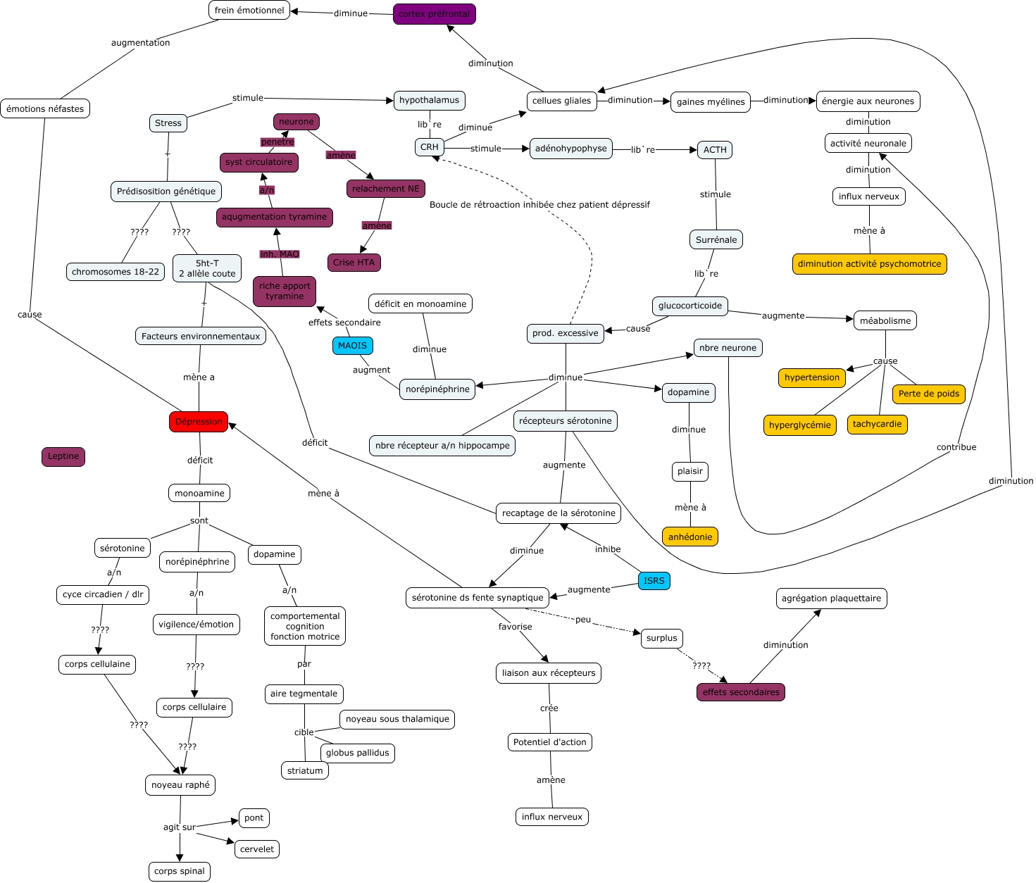 Cette carte de concepts créée avec IHMC CmapTools traite de: Dépression de Goupe exemple, glucocorticoide augmente méabolisme, activité neuronale diminution influx nerveux, Surrénale lib`re glucocorticoide, corps cellulaine ???? noyeau raphé, prod. excessive diminue dopamine, émotions néfastes cause Dépression, monoamine sont norépinéphrine, énergie aux neurones diminution activité neuronale, MAOIS augment norépinéphrine, prod. excessive diminue récepteurs sérotonine, liaison aux récepteurs crée Potentiel d'action, noyeau raphé agit sur corps spinal, riche apport tyramine inh. MAO aqugmentation tyramine, CRH stimule adénohypophyse, 5ht-T 2 allèle coute déficit recaptage de la sérotonine, norépinéphrine a/n vigilence/émotion, glucocorticoide cause prod. excessive, syst circulatoire penetre neurone, sérotonine ds fente synaptique peu surplus, dopamine diminue plaisir