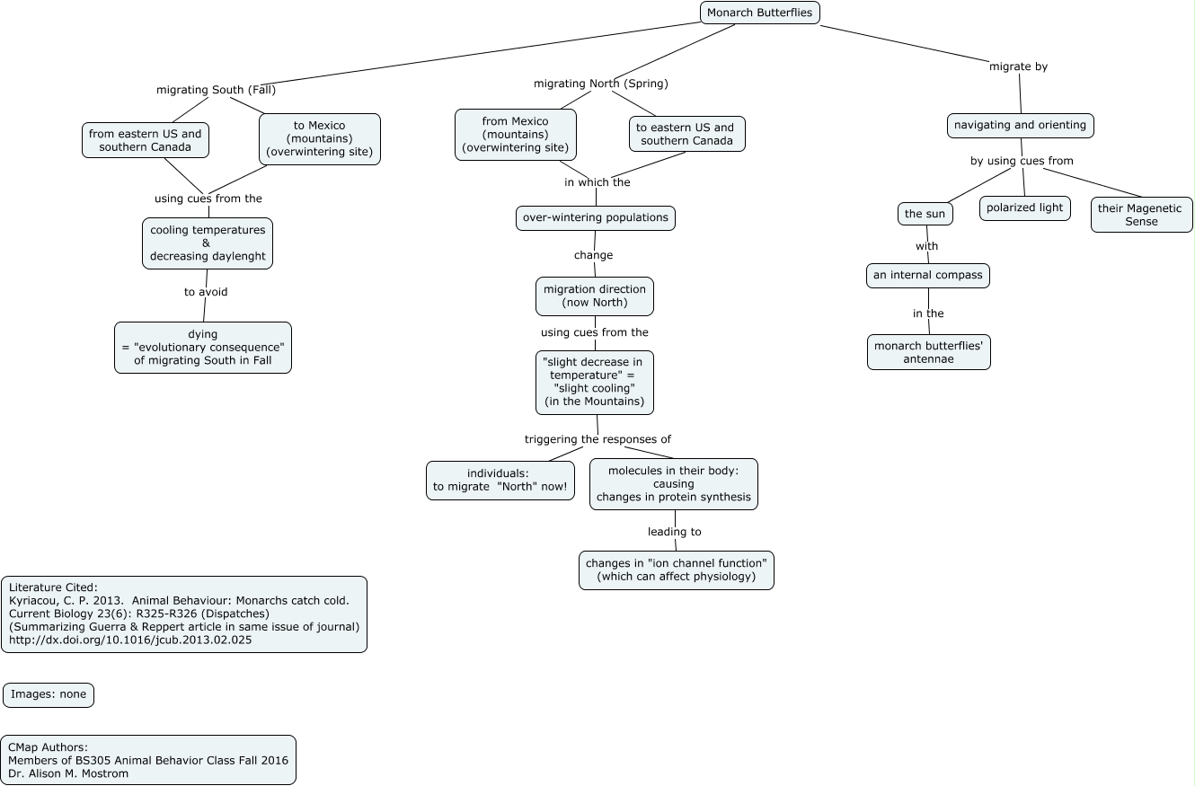 This Concept Map, created with IHMC CmapTools, has information related to: Monarch Butterfly (2ndary article), Monarch Butterflies migrate by navigating and orienting, "slight decrease in temperature" = "slight cooling" (in the Mountains) triggering the responses of individuals: to migrate "North" now!, cooling temperatures & decreasing daylenght to avoid dying = "evolutionary consequence" of migrating South in Fall, Monarch Butterflies migrating North (Spring) from Mexico (mountains) (overwintering site), migration direction (now North) using cues from the "slight decrease in temperature" = "slight cooling" (in the Mountains), from Mexico (mountains) (overwintering site) in which the over-wintering populations, an internal compass in the monarch butterflies' antennae, navigating and orienting by using cues from the sun, from eastern US and southern Canada using cues from the cooling temperatures & decreasing daylenght, molecules in their body: causing changes in protein synthesis leading to changes in "ion channel function" (which can affect physiology), navigating and orienting by using cues from their Magenetic Sense, navigating and orienting by using cues from polarized light, "slight decrease in temperature" = "slight cooling" (in the Mountains) triggering the responses of molecules in their body: causing changes in protein synthesis, to Mexico (mountains) (overwintering site) using cues from the cooling temperatures & decreasing daylenght, the sun with an internal compass, from Mexico (mountains) (overwintering site) in which the to eastern US and southern Canada, Monarch Butterflies migrating South (Fall) from eastern US and southern Canada, Monarch Butterflies migrating North (Spring) to eastern US and southern Canada, Monarch Butterflies migrating South (Fall) to Mexico (mountains) (overwintering site), over-wintering populations change migration direction (now North)