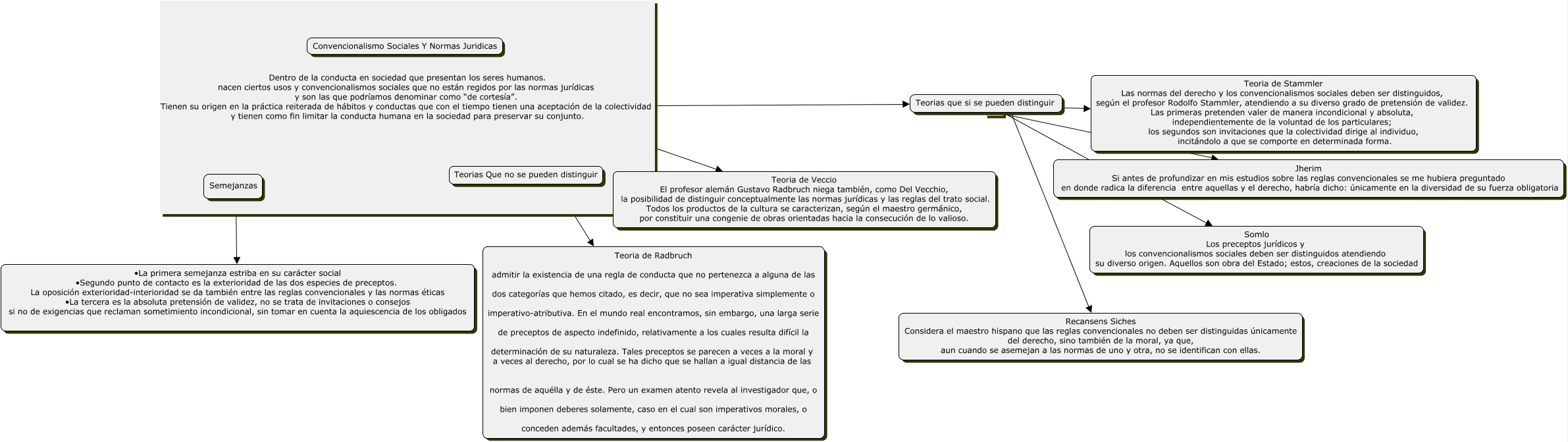 Este Cmap, tiene información relacionada con: Sin Título 6, Semejanzas ???? • La primera semejanza estriba en su carácter social • Segundo punto de contacto es la exterioridad de las dos especies de preceptos. La oposición exterioridad-interioridad se da también entre las reglas convencionales y las normas éticas • La tercera es la absoluta pretensión de validez, no se trata de invitaciones o consejos si no de exigencias que reclaman sometimiento incondicional, sin tomar en cuenta la aquiescencia de los obligados, Semejanzas Dentro de la conducta en sociedad que presentan los seres humanos. nacen ciertos usos y convencionalismos sociales que no están regidos por las normas jurídicas y son las que podríamos denominar como “de cortesía”. Tienen su origen en la práctica reiterada de hábitos y conductas que con el tiempo tienen una aceptación de la colectividad y tienen como fin limitar la conducta humana en la sociedad para preservar su conjunto. Teorias Que no se pueden distinguir, Teorias que si se pueden distinguir ???? Teoria de Stammler Las normas del derecho y los convencionalismos sociales deben ser distinguidos, según el profesor Rodolfo Stammler, atendiendo a su diverso grado de pretensión de validez. Las primeras pretenden valer de manera incondicional y absoluta, independientemente de la voluntad de los particulares; los segundos son invitaciones que la colectividad dirige al individuo, incitándolo a que se comporte en determinada forma., Convencionalismo Sociales Y Normas Juridicas Dentro de la conducta en sociedad que presentan los seres humanos. nacen ciertos usos y convencionalismos sociales que no están regidos por las normas jurídicas y son las que podríamos denominar como “de cortesía”. Tienen su origen en la práctica reiterada de hábitos y conductas que con el tiempo tienen una aceptación de la colectividad y tienen como fin limitar la conducta humana en la sociedad para preservar su conjunto. Teorias que si se pueden distinguir, Teorias Que no se pueden distinguir ???? Teoria de Radbruch admitir la existencia de una regla de conducta que no pertenezca a alguna de las dos categorías que hemos citado, es decir, que no sea imperativa simplemente o imperativo-atributiva. En el mundo real encontramos, sin embargo, una larga serie de preceptos de aspecto indefinido, relativamente a los cuales resulta difícil la determinación de su naturaleza. Tales preceptos se parecen a veces a la moral y a veces al derecho, por lo cual se ha dicho que se hallan a igual distancia de las normas de aquélla y de éste. Pero un examen atento revela al investigador que, o bien imponen deberes solamente, caso en el cual son imperativos morales, o conceden además facultades, y entonces poseen carácter jurídico., Convencionalismo Sociales Y Normas Juridicas Dentro de la conducta en sociedad que presentan los seres humanos. nacen ciertos usos y convencionalismos sociales que no están regidos por las normas jurídicas y son las que podríamos denominar como “de cortesía”. Tienen su origen en la práctica reiterada de hábitos y conductas que con el tiempo tienen una aceptación de la colectividad y tienen como fin limitar la conducta humana en la sociedad para preservar su conjunto. Semejanzas, Teorias que si se pueden distinguir ???? Jherim Si antes de profundizar en mis estudios sobre las reglas convencionales se me hubiera preguntado en donde radica la diferencia entre aquellas y el derecho, habría dicho: únicamente en la diversidad de su fuerza obligatoria, Teorias que si se pueden distinguir ???? Somlo Los preceptos jurídicos y los convencionalismos sociales deben ser distinguidos atendiendo su diverso origen. Aquellos son obra del Estado; estos, creaciones de la sociedad, Semejanzas Dentro de la conducta en sociedad que presentan los seres humanos. nacen ciertos usos y convencionalismos sociales que no están regidos por las normas jurídicas y son las que podríamos denominar como “de cortesía”. Tienen su origen en la práctica reiterada de hábitos y conductas que con el tiempo tienen una aceptación de la colectividad y tienen como fin limitar la conducta humana en la sociedad para preservar su conjunto. Teorias que si se pueden distinguir, Teorias que si se pueden distinguir ???? Recansens Siches Considera el maestro hispano que las reglas convencionales no deben ser distinguidas únicamente del derecho, sino también de la moral, ya que, aun cuando se asemejan a las normas de uno y otra, no se identifican con ellas., Convencionalismo Sociales Y Normas Juridicas Dentro de la conducta en sociedad que presentan los seres humanos. nacen ciertos usos y convencionalismos sociales que no están regidos por las normas jurídicas y son las que podríamos denominar como “de cortesía”. Tienen su origen en la práctica reiterada de hábitos y conductas que con el tiempo tienen una aceptación de la colectividad y tienen como fin limitar la conducta humana en la sociedad para preservar su conjunto. Teorias Que no se pueden distinguir, Teorias Que no se pueden distinguir ???? Teoria de Veccio El profesor alemán Gustavo Radbruch niega también, como Del Vecchio, la posibilidad de distinguir conceptualmente las normas jurídicas y las reglas del trato social. Todos los productos de la cultura se caracterizan, según el maestro germánico, por constituir una congenie de obras orientadas hacia la consecución de lo valioso.