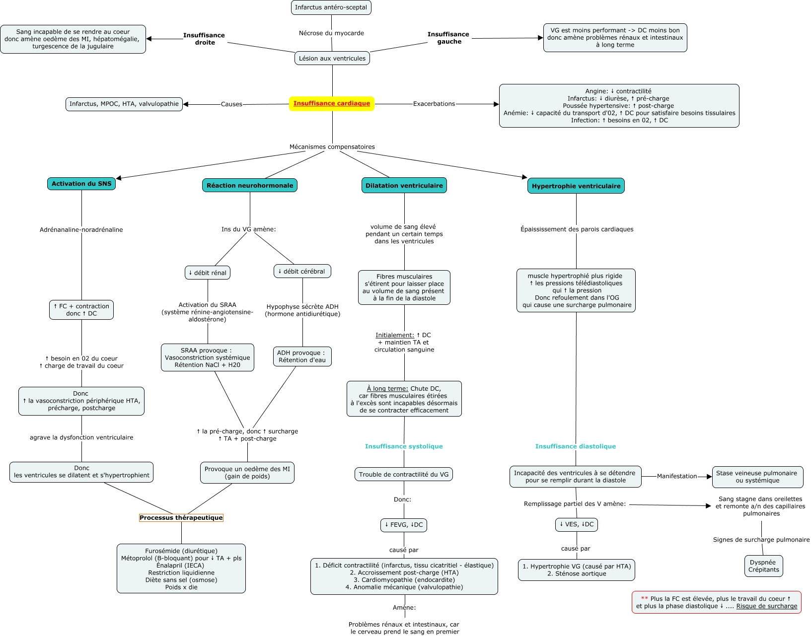 Cette carte de concepts créée avec IHMC CmapTools traite de: insuffisance cardiaque, Sang stagne dans oreilettes et remonte a/n des capillaires pulmonaires Signes de surcharge pulmonaire Dyspnée Crépitants, 1. Déficit contractilité (infarctus, tissu cicatritiel - élastique) 2. Accroissement post-charge (HTA) 3. Cardiomyopathie (endocardite) 4. Anomalie mécanique (valvulopathie) Amène: Problèmes rénaux et intestinaux, car le cerveau prend le sang en premier, Lésion aux ventricules Mécanismes compensatoires Réaction neurohormonale, Lésion aux ventricules Insuffisance gauche VG est moins performant -> DC moins bon donc amène problèmes rénaux et intestinaux à long terme, muscle hypertrophié plus rigide ↑ les pressions télédiastoliques qui ↑ la pression Donc refoulement dans l'OG qui cause une surcharge pulmonaire Insuffisance diastolique Incapacité des ventricules à se détendre pour se remplir durant la diastole, Réaction neurohormonale Ins du VG amène: ↓ débit rénal, À long terme: Chute DC, car fibres musculaires étirées à l'excès sont incapables désormais de se contracter efficacement Insuffisance systolique Trouble de contractilité du VG, Activation du SNS Adrénanaline-noradrénaline ↑ FC + contraction donc ↑ DC, Insuffisance cardiaque Causes Infarctus, MPOC, HTA, valvulopathie, Lésion aux ventricules Mécanismes compensatoires Activation du SNS, Fibres musculaires s'étirent pour laisser place au volume de sang présent à la fin de la diastole Initialement: ↑ DC + maintien TA et circulation sanguine À long terme: Chute DC, car fibres musculaires étirées à l'excès sont incapables désormais de se contracter efficacement, Dilatation ventriculaire volume de sang élevé pendant un certain temps dans les ventricules Fibres musculaires s'étirent pour laisser place au volume de sang présent à la fin de la diastole, ↑ FC + contraction donc ↑ DC ↑ besoin en 02 du coeur ↑ charge de travail du coeur Donc ↑ la vasoconstriction périphérique HTA, précharge, postcharge, Lésion aux ventricules Mécanismes compensatoires Dilatation ventriculaire, Lésion aux ventricules Mécanismes compensatoires Hypertrophie ventriculaire, Lésion aux ventricules Insuffisance droite Sang incapable de se rendre au coeur donc amène oedème des MI, hépatomégalie, turgescence de la jugulaire, Incapacité des ventricules à se détendre pour se remplir durant la diastole Manifestation Stase veineuse pulmonaire ou systémique, SRAA provoque : Vasoconstriction systémique Rétention NaCl + H20 ↑ la pré-charge, donc ↑ surcharge ↑ TA + post-charge Provoque un oedème des MI (gain de poids), Hypertrophie ventriculaire Épaississement des parois cardiaques muscle hypertrophié plus rigide ↑ les pressions télédiastoliques qui ↑ la pression Donc refoulement dans l'OG qui cause une surcharge pulmonaire, ↓ VES, ↓DC causé par 1. Hypertrophie VG (causé par HTA) 2. Sténose aortique