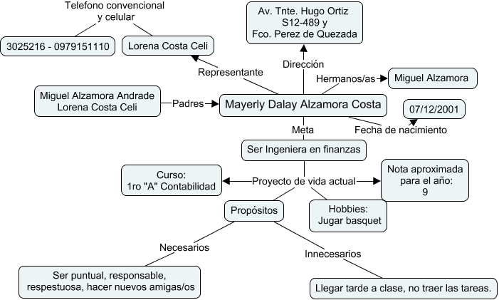 Este Cmap, tiene información relacionada con: INFORMACION, Mayerly Dalay Alzamora Costa Dirección Av. Tnte. Hugo Ortiz S12-489 y Fco. Perez de Quezada, Mayerly Dalay Alzamora Costa Hermanos/as Miguel Alzamora, Ser Ingeniera en finanzas Proyecto de vida actual Curso: 1ro "A" Contabilidad, Mayerly Dalay Alzamora Costa Fecha de nacimiento 07/12/2001, Ser Ingeniera en finanzas Proyecto de vida actual Propósitos, Propósitos Innecesarios Llegar tarde a clase, no traer las tareas., Lorena Costa Celi Telefono convencional y celular 3025216 - 0979151110, Miguel Alzamora Andrade Lorena Costa Celi Padres Mayerly Dalay Alzamora Costa, Propósitos Necesarios Ser puntual, responsable, respestuosa, hacer nuevos amigas/os, Ser Ingeniera en finanzas Proyecto de vida actual Nota aproximada para el año: 9, Mayerly Dalay Alzamora Costa Meta Ser Ingeniera en finanzas, Mayerly Dalay Alzamora Costa Representante Lorena Costa Celi, Ser Ingeniera en finanzas Proyecto de vida actual Hobbies: Jugar basquet