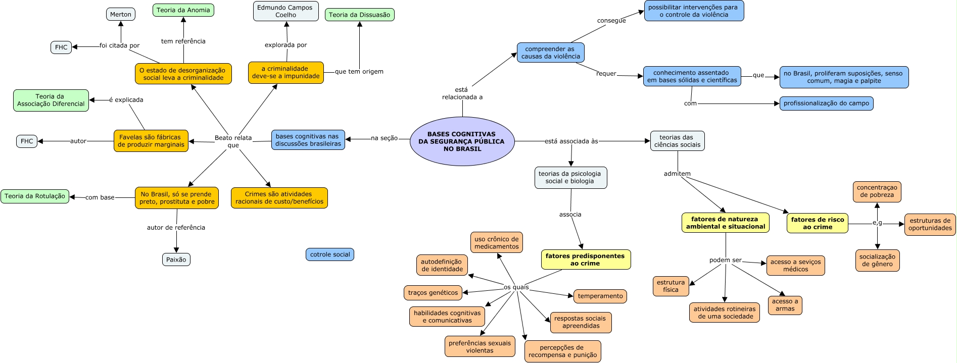 Este Cmap, tiene información relacionada con: MC Crimes e Cidades, O estado de desorganização social leva a criminalidade foi citada por Merton, bases cognitivas nas discussões brasileiras Beato relata que No Brasil, só se prende preto, prostituta e pobre, O estado de desorganização social leva a criminalidade tem referência Teoria da Anomia, fatores de natureza ambiental e situacional podem ser atividades rotineiras de uma sociedade, teorias das ciências sociais admitem fatores de natureza ambiental e situacional, fatores de risco ao crime e,g socialização de gênero, No Brasil, só se prende preto, prostituta e pobre autor de referência Paixão, BASES COGNITIVAS DA SEGURANÇA PÚBLICA NO BRASIL está relacionada a compreender as causas da violência, Favelas são fábricas de produzir marginais é explicada Teoria da Associação Diferencial, fatores de natureza ambiental e situacional podem ser acesso a armas, fatores de risco ao crime e,g concentraçao de pobreza, teorias da psicologia social e biologia associa fatores predisponentes ao crime, a criminalidade deve-se a impunidade que tem origem Teoria da Dissuasão, fatores de natureza ambiental e situacional podem ser estrutura física, fatores predisponentes ao crime os quais percepções de recompensa e punição, fatores predisponentes ao crime os quais traços genéticos, bases cognitivas nas discussões brasileiras Beato relata que Crimes são atividades racionais de custo/benefícios, fatores predisponentes ao crime os quais habilidades cognitivas e comunicativas, BASES COGNITIVAS DA SEGURANÇA PÚBLICA NO BRASIL está associada às teorias da psicologia social e biologia, a criminalidade deve-se a impunidade explorada por Edmundo Campos Coelho