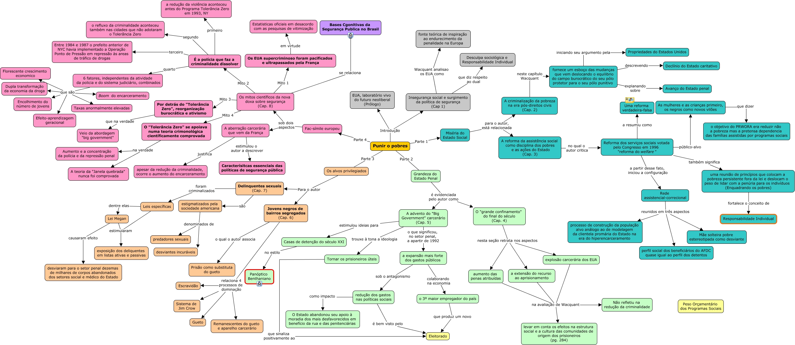 Este Cmap, tiene información relacionada con: MC Punir os Pobres, 6 fatores, independentes da atividade da policia e do sistema judiciário, combinados que são Boom do encarceramento, uma reunião de princípios que colocam a pobreza persistente fora da lei e deslocam o peso de lidar com a penúria para os indivíduos (Enquadrando os pobres) fortalece o conceito de Responsabilidade Individual, Tornar os prisioneiros úteis que sinaliza positivamente ao Eleitorado, Os mitos científicos da nova doxa sobre segurança (Cap. 8) Mito 1 Os EUA supercriminoso foram pacificados e ultrapassados pela França, Lei Megan estimularam exposição dos deliquentes em listas ativas e passivas, Jovens negros de bairros segregados (Cap. 6) relaciona 4 processos de dominação Gueto, a extensão do recurso ao aprisionamento na avaliação de Wacquant Não refletiu na redução da criminalidade, Jovens negros de bairros segregados (Cap. 6) relaciona 4 processos de dominação Sistema de Jim Crow, 6 fatores, independentes da atividade da policia e do sistema judiciário, combinados que são Florescente crescimento economico, explosão carcerária dos EUA na avaliação de Wacquant Não refletiu na redução da criminalidade, fornece um esboço das mudanças que vem deslocando o equilibrio do campo burocrático do seu pólo protetor para o seu pólo punitivo descrevendo Declínio do Estado caritativo, Os mitos científicos da nova doxa sobre segurança (Cap. 8) Mito 2 É a polícia que faz a criminalidade dissolver, aumento das penas atribuídas na avaliação de Wacquant Não refletiu na redução da criminalidade, Punir o pobres Introdução EUA, laboratório vivo do futuro neoliberal (Prólogo), Leis específicas dentre elas Lei Megan, Casas de detenção do século XXI no estilo Panóptico Benthaniano, a expansão mais forte dos gastos públicos colaborando na economia o 3º maior empregador do país, O "Tolerância Zero" se apoiava numa teoria crimonológica científicamente comprovada na verdade A teoria da "Janela quebrada" nunca foi comprovada, A aberração carcerária que vem da França justifica apesar da redução da criminalidade, ocorre o aumento do encarceramento, É a polícia que faz a criminalidade dissolver primeiro a redução da violência aconteceu antes do Programa Tolerância Zero em 1993, NY