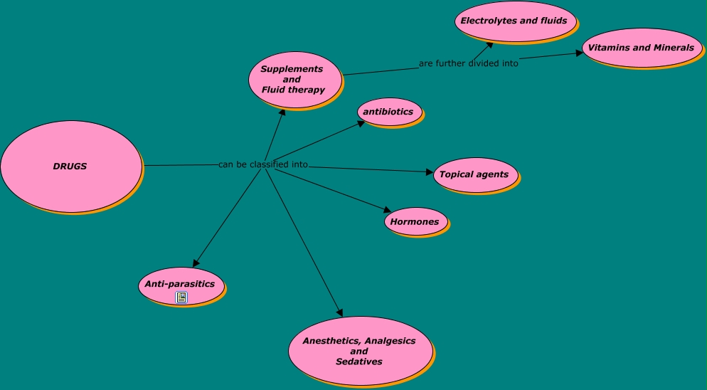 This Concept Map, created with IHMC CmapTools, has information related to: rough version, DRUGS can be classified into Supplements and Fluid therapy, DRUGS can be classified into Hormones, DRUGS can be classified into antibiotics, DRUGS can be classified into Anesthetics, Analgesics and Sedatives, DRUGS can be classified into Topical agents, Supplements and Fluid therapy are further divided into Electrolytes and fluids, Supplements and Fluid therapy are further divided into Vitamins and Minerals, DRUGS can be classified into Anti-parasitics