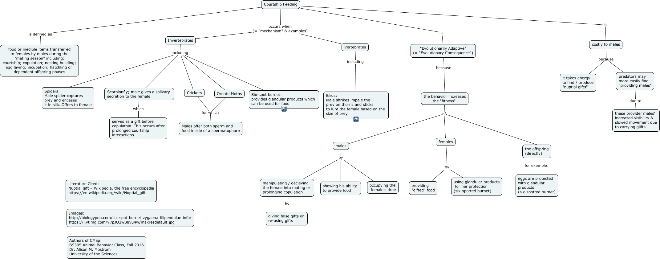 This Concept Map, created with IHMC CmapTools, has information related to: Courtship Feed Def Mech AdFunct 091616, Courtship Feeding is costly to males, Invertebrates including Scorpionfly; male gives a salivary secretion to the female, females by using glandular products for her protection (six-spotted burnet), females by providing "gifted" food, Ornate Moths for which Males offer both sperm and food inside of a spermatophore, costly to males because predators may more easily find "providing males", costly to males because it takes energy to find / produce "nuptial gifts", Vertebrates including Birds; Male shrikes impale the prey on thorns and sticks to lure the female based on the size of prey, the behavior increases the "fitness" of males, the behavior increases the "fitness" of females, Courtship Feeding occurs when (= "mechanism" & examples) Vertebrates, Invertebrates including Crickets, Courtship Feeding occurs when (= "mechanism" & examples) Invertebrates, the behavior increases the "fitness" of the offspring (directly), the offspring (directly) for example: eggs are protected with glandular products (six-spotted burnet), males by manipulating / decieving the female into mating or prolonging copulation, Scorpionfly; male gives a salivary secretion to the female which serves as a gift before copulatoin. This occurs after prolonged courtship interactions, males by showing his ability to provide food, Courtship Feeding is "Evolutionarily Adaptive" (= "Evolutionary Consequence"), males by occupying the female's time