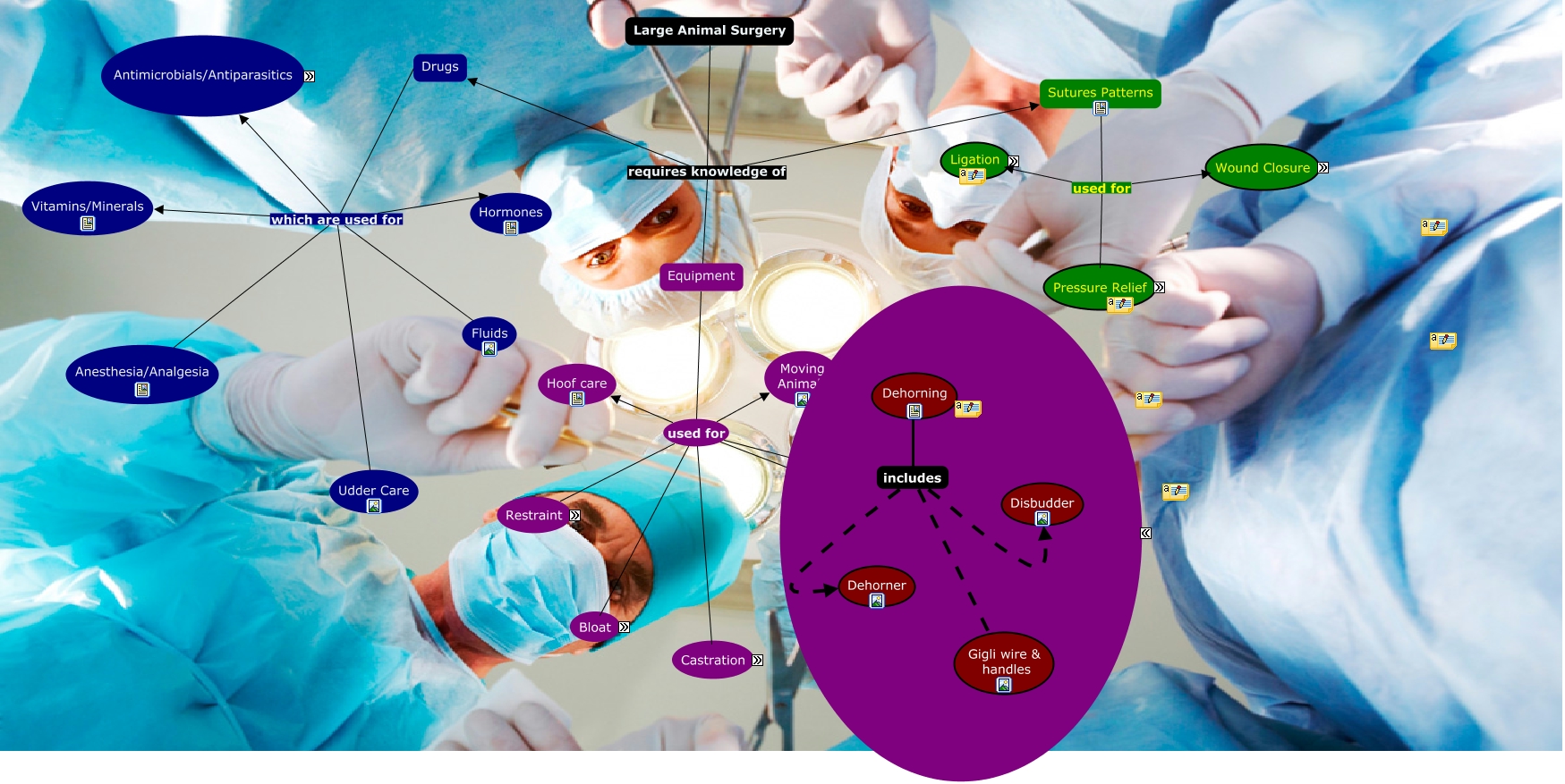 This Concept Map, created with IHMC CmapTools, has information related to: VET2018 LAS GROUP B LAB 1, Restraint Includes Cattle Mouth Gag, Castration Includes Emasculator, Pressure relief Includes Vertical Mattress, Drugs which are used for Udder Care, Equipment used for Bloat, Antimicrobials includes Anthelmentics, Equipment used for Obstetrics, Antimicrobials includes Antibiotics, Bloat Includes Trocar and Cannula, Ligation includes Figure 8, Drugs which are used for Hormones, Restraint Includes Nose Ring, Wound apposition includes Ford interlocking, Large Animal Surgery requires knowledge of Sutures Patterns, Dehorning includes Gigli wire & handles, Equipment used for Hoof care, Drugs which are used for Fluids, Equipment used for Dehorning, Dehorning includes Disbudder, Pressure relief Includes Horizontal Matress