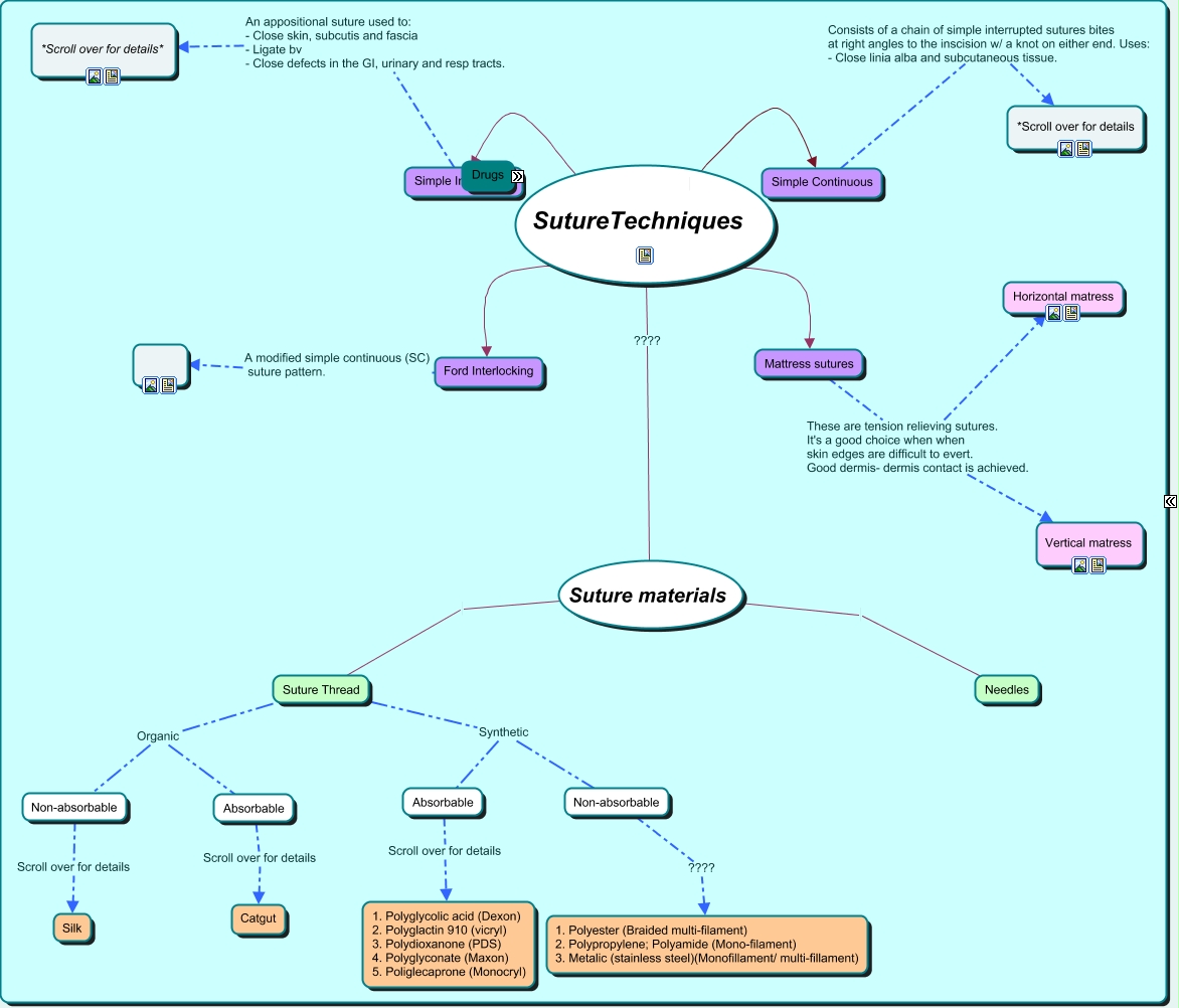 This Concept Map, created with IHMC CmapTools, has information related to: collabed cmap, LAB1 Instrument, Absorbable Scroll over for details Catgut, Sutures ???? LAB1, Suture Thread Synthetic Non-absorbable, Mattress sutures These are tension relieving sutures. It's a good choice when when skin edges are difficult to evert. Good dermis- dermis contact is achieved. Horizontal matress, Non-absorbable Scroll over for details Silk, Suture materials Needles, DRUGS can be classified into Anti-parasitics, Supplements and Fluid therapy are further divided into Electrolytes and fluids, Suture Thread Organic Absorbable, DRUGS can be classified into antibiotics, SutureTechniques Simple Continuous, Suture Thread Synthetic Absorbable, DRUGS can be classified into Topical agents, Suture materials Suture Thread, DRUGS can be classified into Hormones, Suture Thread Organic Non-absorbable, SutureTechniques ???? Ford Interlocking, Suture materials ???? SutureTechniques, Simple Continuous Consists of a chain of simple interrupted sutures bites at right angles to the inscision w/ a knot on either end. Uses: - Close linia alba and subcutaneous tissue. *Scroll over for details