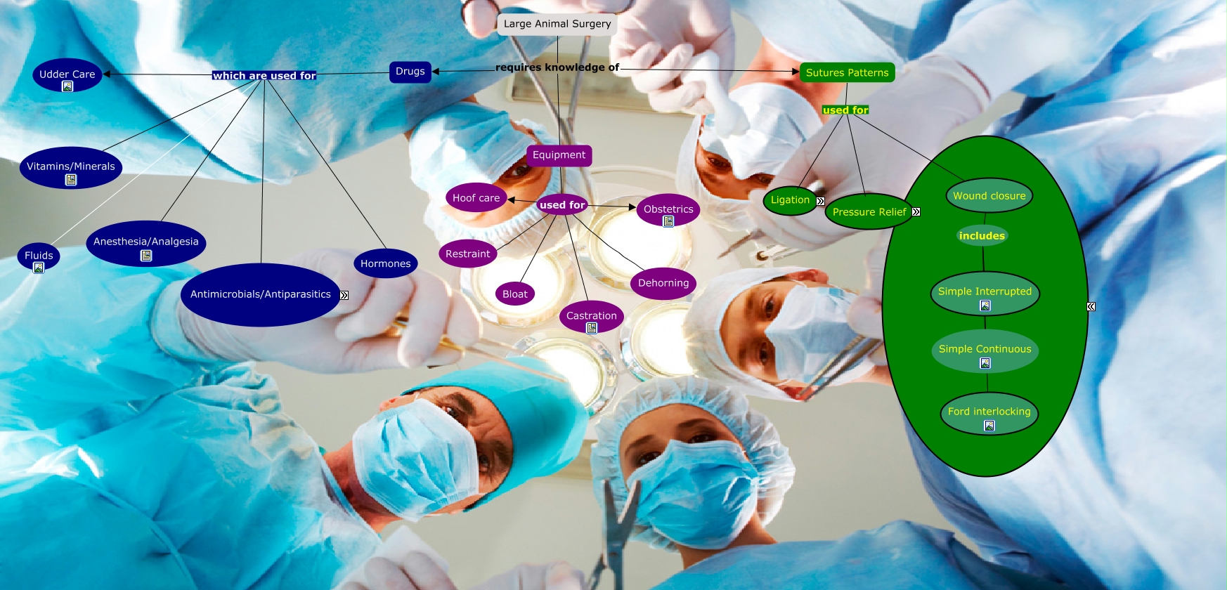 This Concept Map, created with IHMC CmapTools, has information related to: Untitled, Drugs which are used for Hormones, Pressure relief Includes Horizontal Matress, Wound closure includes Simple Continuous, Equipment used for Castration, Large Animal Surgery requires knowledge of Equipment, Antimicrobials includes Antibiotics, Drugs which are used for Fluids, Equipment used for Hoof care, Drugs which are used for Anesthesia/Analgesia, Antimicrobials includes Antifungals, Large Animal Surgery requires knowledge of Drugs, Pressure relief Includes Vertical Mattress, Equipment used for Dehorning, Drugs which are used for Udder Care, Drugs which are used for Antimicrobials/Antiparasitics, Equipment used for Bloat, Wound closure includes Ford interlocking, Sutures Patterns used for Pressure relief, Equipment used for Obstetrics, Sutures Patterns used for Ligation
