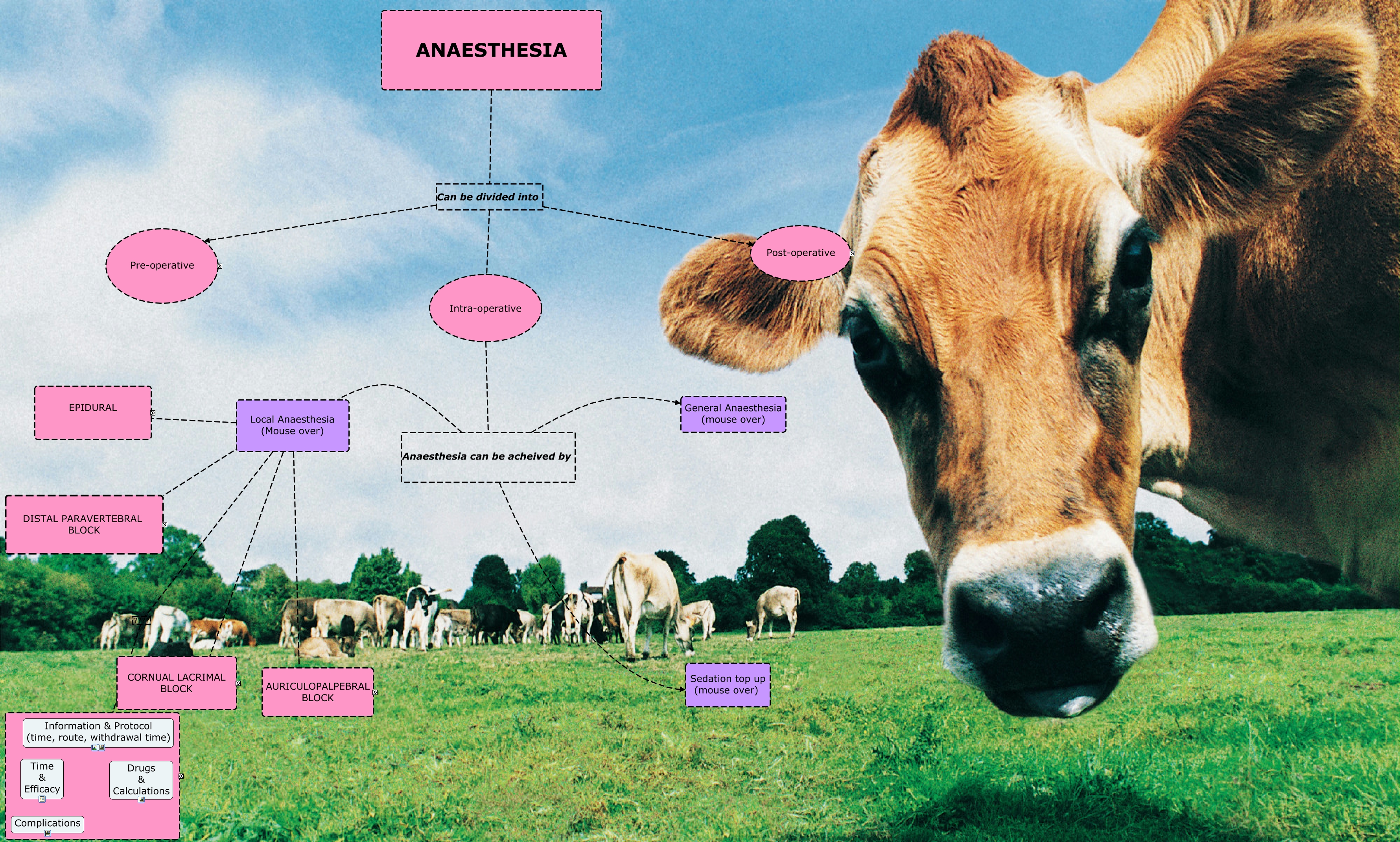 This Concept Map, created with IHMC CmapTools, has information related to: Lab 2, Intra-operative Anaesthesia can be acheived by Sedation top up (mouse over), ANAESTHESIA Can be divided into Pre-operative, Local Anaesthesia (Mouse over) ???? EPIDURAL, ANAESTHESIA Can be divided into Monitoring, Local Anaesthesia (Mouse over) ???? DISTAL PARAVERTEBRAL BLOCK, Local Anaesthesia (Mouse over) ???? IV REGIONAL, ANAESTHESIA Can be divided into Client education (mouse over), ANAESTHESIA Can be divided into Intra-operative, Intra-operative Anaesthesia can be acheived by General Anaesthesia (mouse over), Local Anaesthesia (Mouse over) AURICULOPALPEBRAL BLOCK, Intra-operative Anaesthesia can be acheived by Local Anaesthesia (Mouse over), Local Anaesthesia (Mouse over) CORNUAL LACRIMAL BLOCK