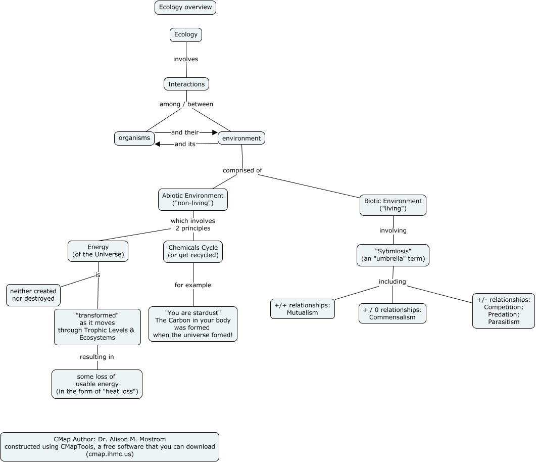 This Concept Map, created with IHMC CmapTools, has information related to: MTOB Ecology, Abiotic Environment ("non-living") which involves 2 principles Chemicals Cycle (or get recycled), Energy (of the Universe) is "transformed" as it moves through Trophic Levels & Ecosystems, organisms and their environment, environment comprised of Biotic Environment ("living"), environment and its organisms, "Sybmiosis" (an "umbrella" term) including +/+ relationships: Mutualism, Biotic Environment ("living") involving "Sybmiosis" (an "umbrella" term), Ecology involves Interactions, Energy (of the Universe) is neither created nor destroyed, "Sybmiosis" (an "umbrella" term) including + / 0 relationships: Commensalism, "Sybmiosis" (an "umbrella" term) including +/- relationships: Competition; Predation; Parasitism, environment comprised of Abiotic Environment ("non-living"), Interactions among / between organisms, Abiotic Environment ("non-living") which involves 2 principles Energy (of the Universe), Interactions among / between environment, Chemicals Cycle (or get recycled) for example "You are stardust" The Carbon in your body was formed when the universe fomed!, "transformed" as it moves through Trophic Levels & Ecosystems resulting in some loss of usable energy (in the form of "heat loss")