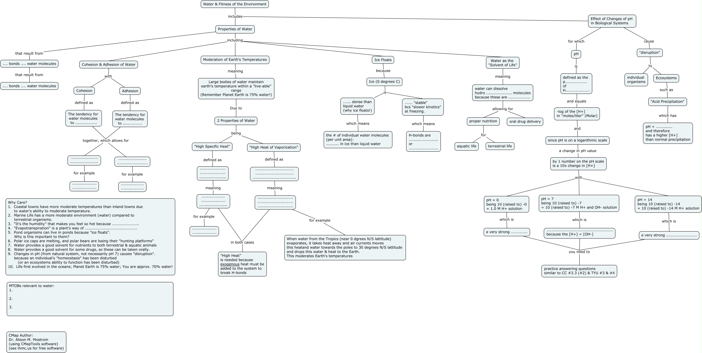 This Concept Map, created with IHMC CmapTools, has information related to: Water CMap, water can dissolve hydro .................... molecules because these are ................. allowing for proper nutrition, Effect of Changes of pH in Biological Systems cause "disruption", "disruption" to individual organisms, a very strong ............. you need to practice answering questions similar to CC #3.3 (#2) & TYU #3 & #4, Ecosystems such as "Acid Precipitation", Adhesion defined as The tendency for water molecules to ..............., Cohesion defined as The tendency for water molecules to ................., Properties of Water that result from .... bonds .... water molecules, Properties of Water including Ice Floats, pH is defined as the p................. of H..................., proper nutrition for terrestrial life, pH = 14 being 10 (raised to) -14 = 10 (raised to) -14 M H+ solution which is a very strong ........................, Ice Floats because Ice (0 degrees C), Properties of Water including Cohesion & Adhesion of Water, by 1 number on the pH scale is a 10x change in [H+] with pH = 0 being 10 (raised to) -0 = 1.0 M H+ solution, pH = 7 being 10 (raised to) -7 = 10 (raised to) -7 M H+ and OH- solution which is .................................................... because the [H+] = [OH-], The tendency for water molecules to ............... together, which allows for ...................... ........................, a very strong ........................ you need to practice answering questions similar to CC #3.3 (#2) & TYU #3 & #4, defined as the p................. of H................... and equals -log of the [H+] in "moles/liter" (Molar), -log of the [H+] in "moles/liter" (Molar) and since pH is on a logarithmic scale