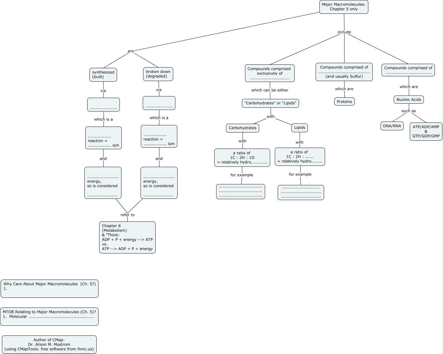 This Concept Map, created with IHMC CmapTools, has information related to: Macromolecules 2016, ....................... energy, so is considered ...................... refer to Chapter 8 (Metabolism) & "Think: ADP + P + energy --> ATP vs. ATP --> ADP + P + energy, a ratio of 1C : 2H : 1O = relatively hydro............ for example ................................ ................................ ................................, Major Macromolecules: Chapter 5 only include Compounds comprised of ...................................... (and usually Sulfur), broken down (degraded) via ...................., "Carbohydrates" or "Lipids" with Lipids, synthesized (built) via ...................., ................. reaction = ................. ism and ....................... energy, so is considered ......................, Carbohydrates with a ratio of 1C : 2H : 1O = relatively hydro............, .................... which is a ................. reaction = ................. ism, Lipids with a ratio of 1C : 2H : ...... = relatively hydro........, a ratio of 1C : 2H : ...... = relatively hydro........ for example ............................ .............................. ............................., Compounds comprised of .................................. which are Nucleic Acids, Major Macromolecules: Chapter 5 only include Compounds comprised exclusively of ............................., Compounds comprised of ...................................... (and usually Sulfur) which are Proteins, .................... which is a ................. reaction = ................. ism, Compounds comprised exclusively of ............................. which can be either "Carbohydrates" or "Lipids", ................. reaction = ................. ism and ....................... energy, so is considered ......................, Major Macromolecules: Chapter 5 only include Compounds comprised of .................................., Major Macromolecules: Chapter 5 only are synthesized (built), Nucleic Acids such as ATP/ADP/AMP & GTP/GDP/GMP