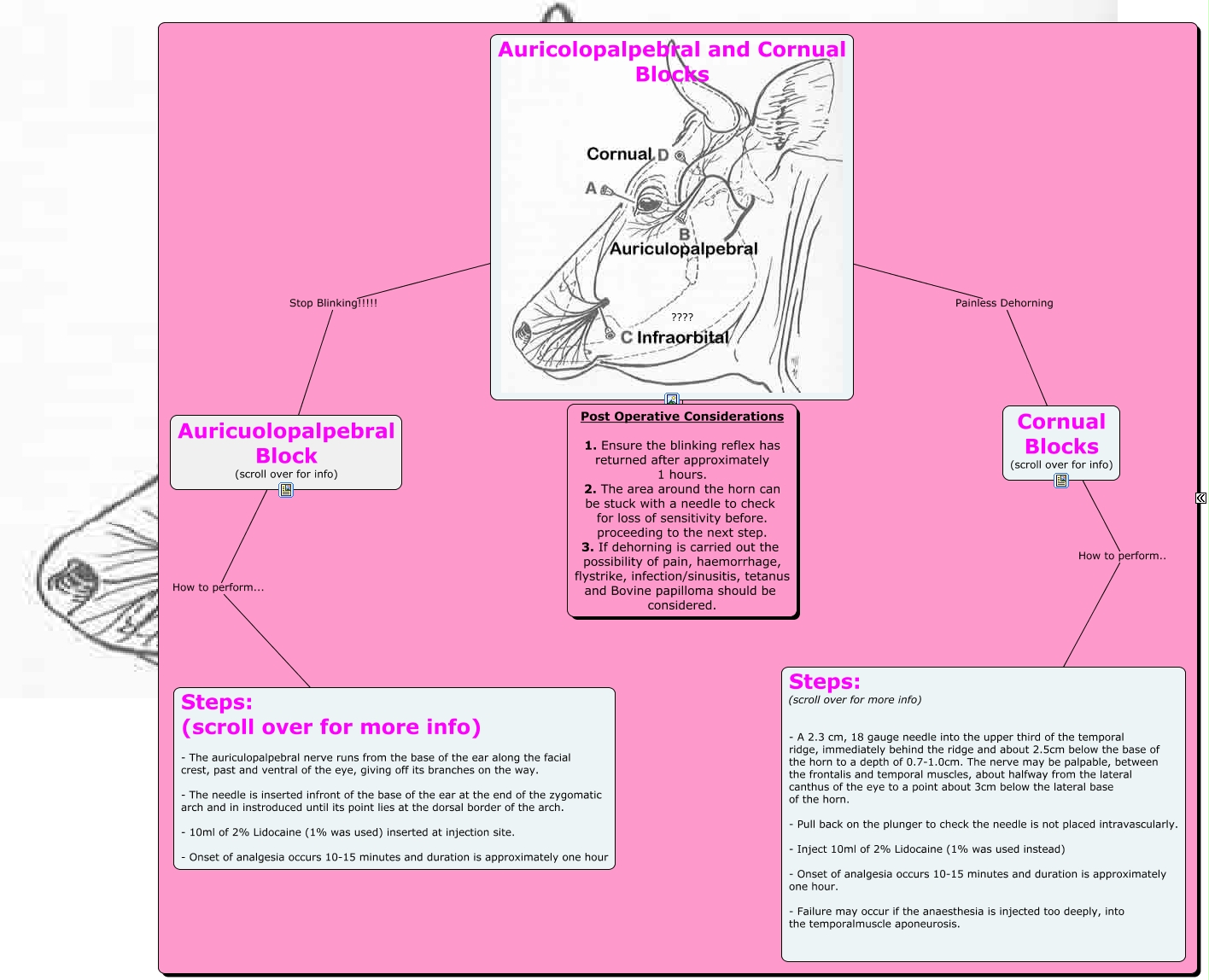 This Concept Map, created with IHMC CmapTools, has information related to: A&C, Cornual Blocks (scroll over for info) How to perform.. Steps: (scroll over for more info) - A 2.3 cm, 18 gauge needle into the upper third of the temporal ridge, immediately behind the ridge and about 2.5cm below the base of the horn to a depth of 0.7-1.0cm. The nerve may be palpable, between the frontalis and temporal muscles, about halfway from the lateral canthus of the eye to a point about 3cm below the lateral base of the horn. - Pull back on the plunger to check the needle is not placed intravascularly. - Inject 10ml of 2% Lidocaine (1% was used instead) - Onset of analgesia occurs 10-15 minutes and duration is approximately one hour. - Failure may occur if the anaesthesia is injected too deeply, into the temporalmuscle aponeurosis., Auricolopalpebral and Cornual Blocks ???? Post Operative Considerations 1. Ensure the blinking reflex has returned after approximately 1 hours. 2. The area around the horn can be stuck with a needle to check for loss of sensitivity before. proceeding to the next step. 3. If dehorning is carried out the possibility of pain, haemorrhage, flystrike, infection/sinusitis, tetanus and Bovine papilloma should be considered., Auricuolopalpebral Block (scroll over for info) How to perform... Steps: (scroll over for more info) - The auriculopalpebral nerve runs from the base of the ear along the facial crest, past and ventral of the eye, giving off its branches on the way. - The needle is inserted infront of the base of the ear at the end of the zygomatic arch and in instroduced until its point lies at the dorsal border of the arch. - 10ml of 2% Lidocaine (1% was used) inserted at injection site. - Onset of analgesia occurs 10-15 minutes and duration is approximately one hour, Auricolopalpebral and Cornual Blocks Painless Dehorning Cornual Blocks (scroll over for info), Auricolopalpebral and Cornual Blocks Stop Blinking!!!!! Auricuolopalpebral Block (scroll over for info)