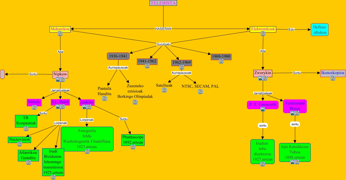 Este Cmap, tiene información relacionada con: karla vega, Mekanikoa Aita Nipkow, Mekanikoa Gurutzatu 1941-1962, J.L. Baird Lorpenak Irudi Bizidunen lehenengo transmisioa 1925.urtean, Zworykin Sortu Ikonoskopioa, Jenkins Lorpenak Fotografia bildu Washintognetik Filadelfiara. 1923.urtean., 1962-1969 Aurrepausoak Sateliteak, J.L. Baird Lorpenak Atlantikoa Gainditu, Mekanikoa Gurutzatu 1936-1941, 1936-1941 Aurrepausoak Zuzeneko emisioak Berkingo Olinpiadak, Mekanikoa Gurutzatu 1962-1969, Elektronikoak Edo Definio altukoa, Jenkins Sortu Phantascope 1892.urtean, Mekanikoa Gurutzatu 1969-1980, J.L. Baird Sortu TB Konpainiak, Ferdinnand Braun sortu Izpi Katodikoen Tuboa 1898.urtean, Elektronikoak Gurutzatu 1962-1969, 1936-1941 Aurrepausoak Pantaila Handitu, Elektronikoak Aita Zworykin, P. T. Fansworth sortu Irudien tubo disektorea 1927.urtean, Zworykin Jarraitzaileak P. T. Fansworth