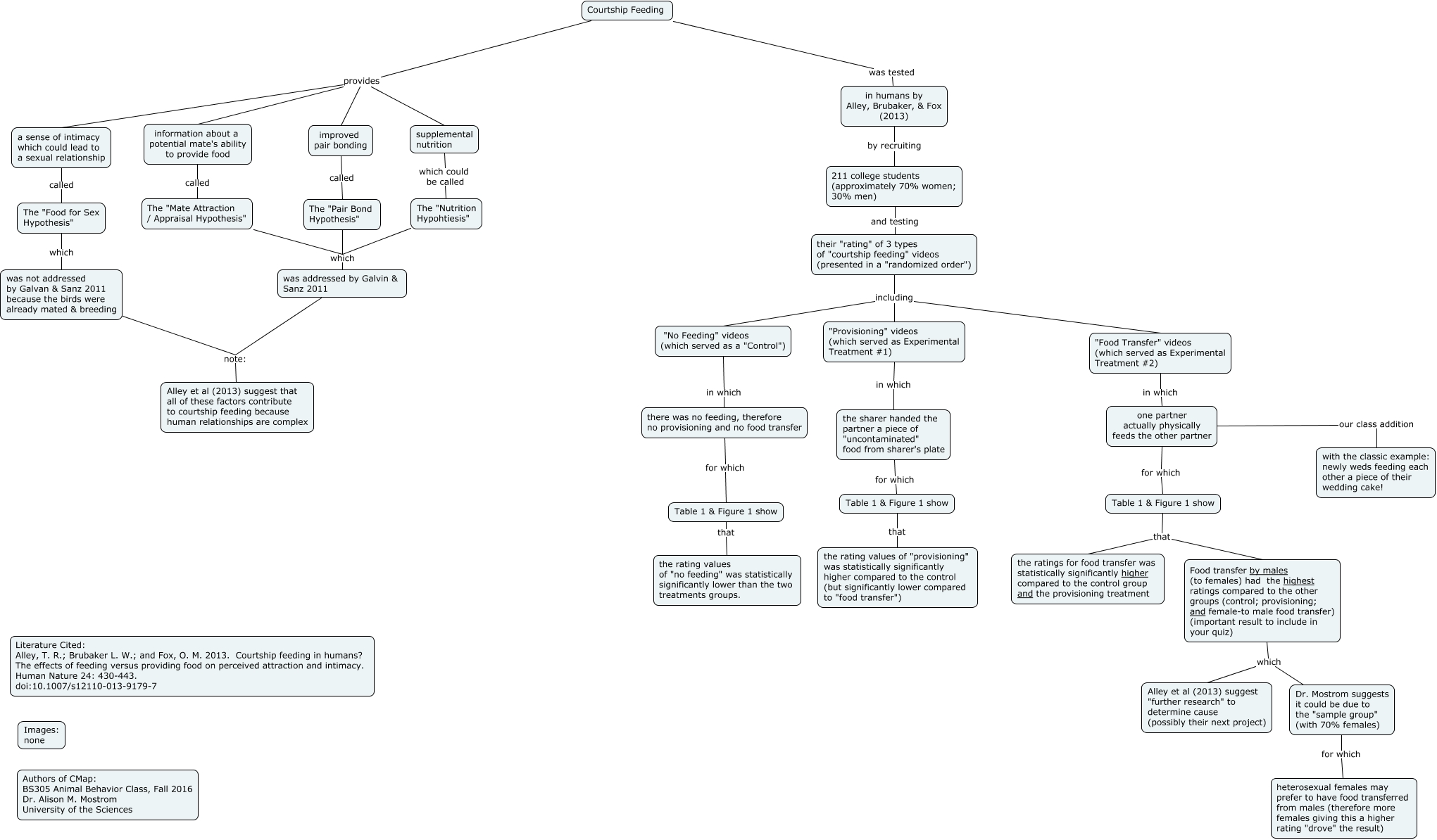 This Concept Map, created with IHMC CmapTools, has information related to: Alley et al 2013 (final), "Provisioning" videos (which served as Experimental Treatment #1) in which the sharer handed the partner a piece of "uncontaminated" food from sharer's plate, supplemental nutrition which could be called The "Nutrition Hypohtiesis", 211 college students (approximately 70% women; 30% men) and testing their "rating" of 3 types of "courtship feeding" videos (presented in a "randomized order"), Table 1 & Figure 1 show that Food transfer by males (to females) had the highest ratings compared to the other groups (control; provisioning; and female-to male food transfer) (important result to include in your quiz), was addressed by Galvin & Sanz 2011 note: Alley et al (2013) suggest that all of these factors contribute to courtship feeding because human relationships are complex, Table 1 & Figure 1 show that the rating values of "no feeding" was statistically significantly lower than the two treatments groups., a sense of intimacy which could lead to a sexual relationship called The "Food for Sex Hypothesis", "No Feeding" videos (which served as a "Control") in which there was no feeding, therefore no provisioning and no food transfer, Courtship Feeding provides a sense of intimacy which could lead to a sexual relationship, Food transfer by males (to females) had the highest ratings compared to the other groups (control; provisioning; and female-to male food transfer) (important result to include in your quiz) which Dr. Mostrom suggests it could be due to the "sample group" (with 70% females), there was no feeding, therefore no provisioning and no food transfer for which Table 1 & Figure 1 show, "Food Transfer" videos (which served as Experimental Treatment #2) in which one partner actually physically feeds the other partner, one partner actually physically feeds the other partner our class addition with the classic example: newly weds feeding each other a piece of their wedding cake!, Courtship Feeding provides information about a potential mate's ability to provide food, Courtship Feeding was tested in humans by Alley, Brubaker, & Fox (2013), Table 1 & Figure 1 show that the rating values of "provisioning" was statistically significantly higher compared to the control (but significantly lower compared to "food transfer"), was not addressed by Galvan & Sanz 2011 because the birds were already mated & breeding note: Alley et al (2013) suggest that all of these factors contribute to courtship feeding because human relationships are complex, Table 1 & Figure 1 show that the ratings for food transfer was statistically significantly higher compared to the control group and the provisioning treatment, their "rating" of 3 types of "courtship feeding" videos (presented in a "randomized order") including "Provisioning" videos (which served as Experimental Treatment #1), Courtship Feeding provides improved pair bonding