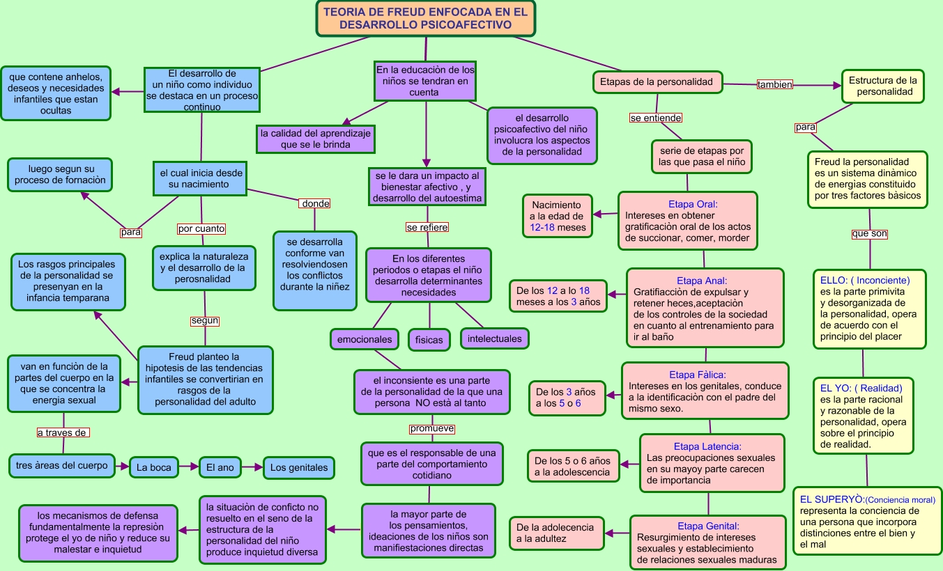 Este Cmap, tiene información relacionada con: TEORIA DE FREUD, ELLO: ( Inconciente) es la parte primivita y desorganizada de la personalidad, opera de acuerdo con el principio del placer ???? EL YO: ( Realidad) es la parte racional y razonable de la personalidad, opera sobre el principio de realidad., Etapa Oral: Intereses en obtener gratificaciòn oral de los actos de succionar, comer, morder inicia Nacimiento a la edad de 12-18 meses, Etapa Fàlica: Intereses en los genitales, conduce a la identificaciòn con el padre del mismo sexo. ???? Etapa Latencia: Las preocupaciones sexuales en su mayoy parte carecen de importancia, En los diferentes periodos o etapas el niño desarrolla determinantes necesidades ???? emocionales, Etapa Anal: Gratifiacciòn de expulsar y retener heces,aceptaciòn de los controles de la sociedad en cuanto al entrenamiento para ir al baño ???? Etapa Fàlica: Intereses en los genitales, conduce a la identificaciòn con el padre del mismo sexo., Etapa Oral: Intereses en obtener gratificaciòn oral de los actos de succionar, comer, morder ???? Etapa Anal: Gratifiacciòn de expulsar y retener heces,aceptaciòn de los controles de la sociedad en cuanto al entrenamiento para ir al baño, el cual inicia desde su nacimiento donde se desarrolla conforme van resolviendosen los conflictos durante la niñez, serie de etapas por las que pasa el niño ???? Etapa Oral: Intereses en obtener gratificaciòn oral de los actos de succionar, comer, morder, Freud la personalidad es un sistema dinàmico de energìas constituido por tres factores bàsicos que son ELLO: ( Inconciente) es la parte primivita y desorganizada de la personalidad, opera de acuerdo con el principio del placer, emocionales ???? el inconsiente es una parte de la personalidad de la que una persona NO està al tanto, la mayor parte de los pensamientos, ideaciones de los niños son manifiestaciones directas ???? la situaciòn de conficto no resuelto en el seno de la estructura de la personalidad del niño produce inquietud diversa, el cual inicia desde su nacimiento para luego segun su proceso de fornaciòn, TEORIA DE FREUD ENFOCADA EN EL DESARROLLO PSICOAFECTIVO El desarrollo de un niño como individuo se destaca en un proceso continuo que contene anhelos, deseos y necesidades infantiles que estan ocultas, se le dara un impacto al bienestar afectivo , y desarrollo del autoestima se refiere En los diferentes periodos o etapas el niño desarrolla determinantes necesidades, Etapa Fàlica: Intereses en los genitales, conduce a la identificaciòn con el padre del mismo sexo. ???? De los 3 años a los 5 o 6, Estructura de la personalidad para Freud la personalidad es un sistema dinàmico de energìas constituido por tres factores bàsicos, Etapas de la personalidad tambien Estructura de la personalidad, EL YO: ( Realidad) es la parte racional y razonable de la personalidad, opera sobre el principio de realidad. ???? EL SUPERYÒ:(Conciencia moral) representa la conciencia de una persona que incorpora distinciones entre el bien y el mal, La boca ???? El ano, En los diferentes periodos o etapas el niño desarrolla determinantes necesidades ???? intelectuales