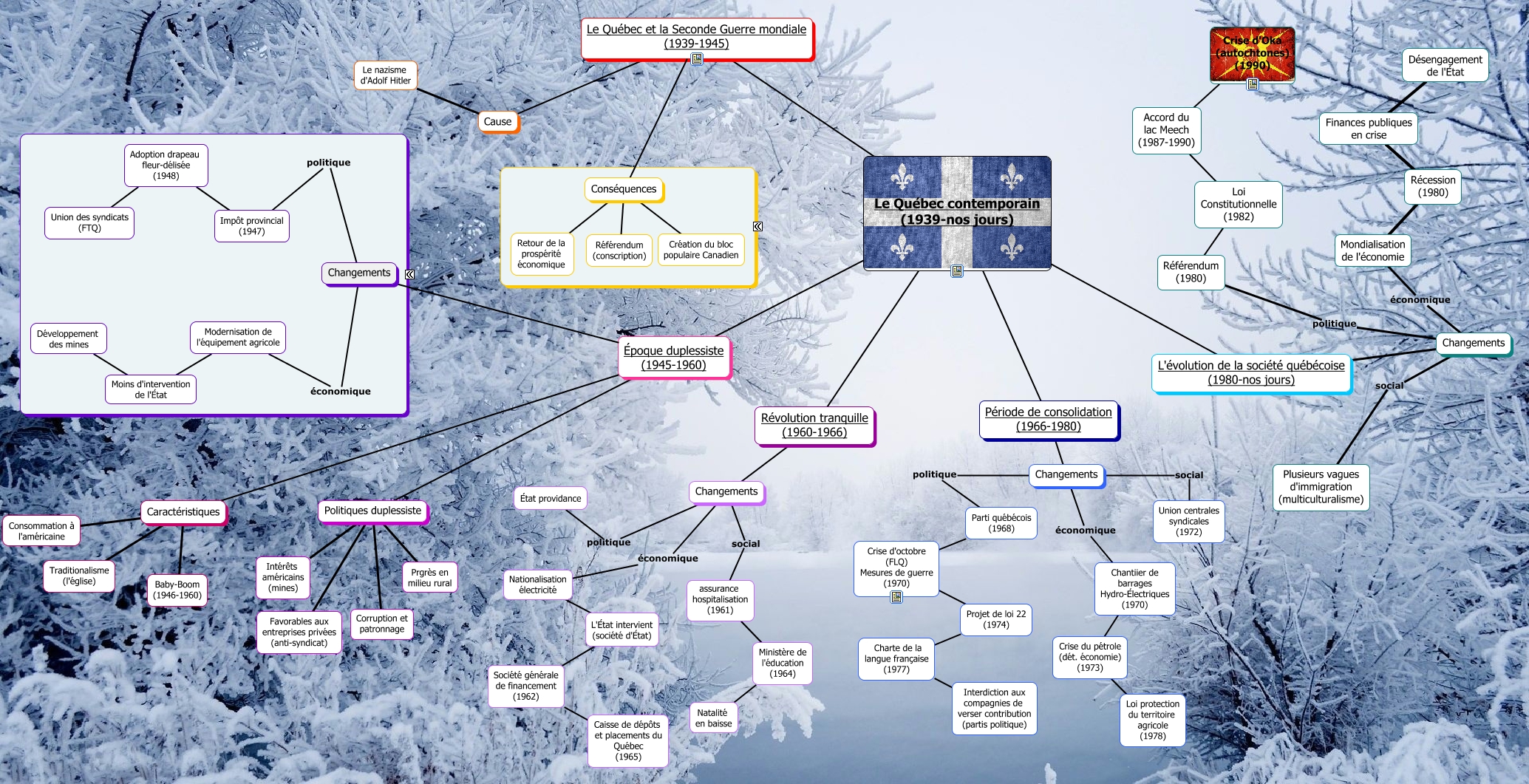 Cette carte de concepts créée avec IHMC CmapTools traite de: Travail Info 2, Cause Le Québec et la Seconde Guerre mondiale (1939-1945), Consommation à l'américaine Caractéristiques, Référendum (conscription) Conséquences, Société générale de financement (1962) L'État intervient (société d'État), Natalité en baisse Ministère de l'éducation (1964), Interdiction aux compagnies de verser contribution (partis politique) Charte de la langue française (1977), Retour de la prospérité économique Conséquences, Révolution tranquille (1960-1966) Le Québec contemporain (1939-nos jours), Loi Constitutionnelle (1982) Référendum (1980), Baby-Boom (1946-1960) Caractéristiques, assurance hospitalisation (1961) social Changements, Loi protection du territoire agricole (1978) Crise du pétrole (dét. économie) (1973), Époque duplessiste (1945-1960) Le Québec contemporain (1939-nos jours), Prgrès en milieu rural Politiques duplessiste, Le Québec et la Seconde Guerre mondiale (1939-1945) Le Québec contemporain (1939-nos jours), Caisse de dépôts et placements du Québec (1965) Société générale de financement (1962), Union centrales syndicales (1972) social Changements, Mondialisation de l'économie économique Changements, Corruption et patronnage Politiques duplessiste, Période de consolidation (1966-1980) Le Québec contemporain (1939-nos jours)
