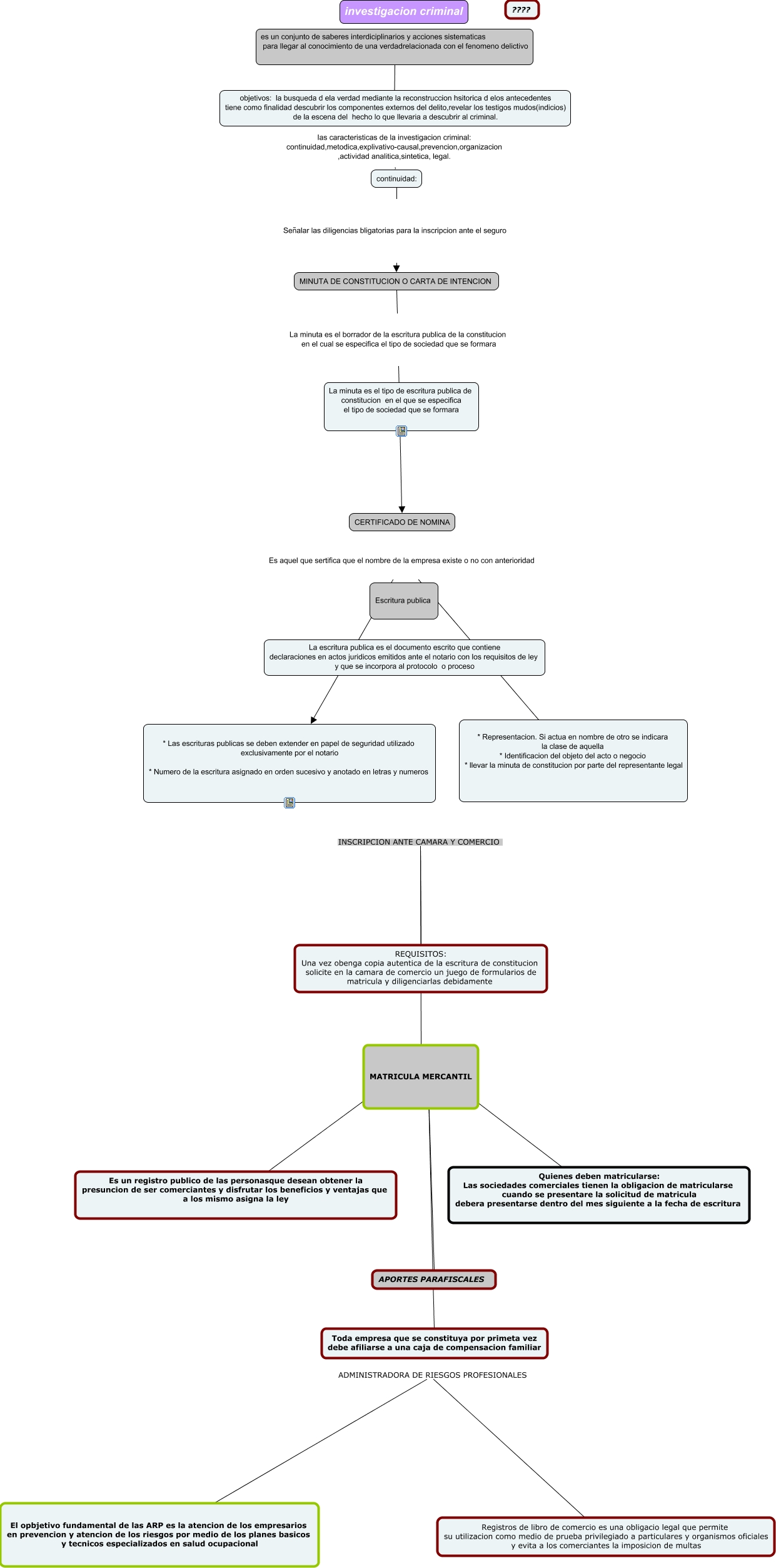 Este Cmap, tiene información relacionada con: investigacion criminal, Quienes deben matricularse: Las sociedades comerciales tienen la obligacion de matricularse cuando se presentare la solicitud de matricula debera presentarse dentro del mes siguiente a la fecha de escritura ???? Es un registro publico de las personasque desean obtener la presuncion de ser comerciantes y disfrutar los beneficios y ventajas que a los mismo asigna la ley, es un conjunto de saberes interdiciplinarios y acciones sistematicas para llegar al conocimiento de una verdadrelacionada con el fenomeno delictivo Ias caracteristicas de la investigacion criminal: continuidad,metodica,explivativo-causal,prevencion,organizacion ,actividad analitica,sintetica, legal. , continuidad:, continuidad: Señalar las diligencias bligatorias para la inscripcion ante el seguro MINUTA DE CONSTITUCION O CARTA DE INTENCION, * Representacion. Si actua en nombre de otro se indicara la clase de aquella * Identificacion del objeto del acto o negocio * llevar la minuta de constitucion por parte del representante legal Es aquel que sertifica que el nombre de la empresa existe o no con anterioridad * Las escrituras publicas se deben extender en papel de seguridad utilizado exclusivamente por el notario * Numero de la escritura asignado en orden sucesivo y anotado en letras y numeros, Toda empresa que se constituya por primeta vez debe afiliarse a una caja de compensacion familiar ???? APORTES PARAFISCALES, MINUTA DE CONSTITUCION O CARTA DE INTENCION La minuta es el borrador de la escritura publica de la constitucion en el cual se especifica el tipo de sociedad que se formara CERTIFICADO DE NOMINA, Registros de libro de comercio es una obligacio legal que permite su utilizacion como medio de prueba privilegiado a particulares y organismos oficiales y evita a los comerciantes la imposicion de multas ADMINISTRADORA DE RIESGOS PROFESIONALES El opbjetivo fundamental de las ARP es la atencion de los empresarios en prevencion y atencion de los riesgos por medio de los planes basicos y tecnicos especializados en salud ocupacional, objetivos: la busqueda d ela verdad mediante la reconstruccion hsitorica d elos antecedentes tiene como finalidad descubrir los componentes externos del delito,revelar los testigos mudos(indicios) de la escena del hecho lo que llevaria a descubrir al criminal. Ias caracteristicas de la investigacion criminal: continuidad,metodica,explivativo-causal,prevencion,organizacion ,actividad analitica,sintetica, legal. , continuidad:, REQUISITOS: Una vez obenga copia autentica de la escritura de constitucion solicite en la camara de comercio un juego de formularios de matricula y diligenciarlas debidamente INSCRIPCION ANTE CAMARA Y COMERCIO MATRICULA MERCANTIL