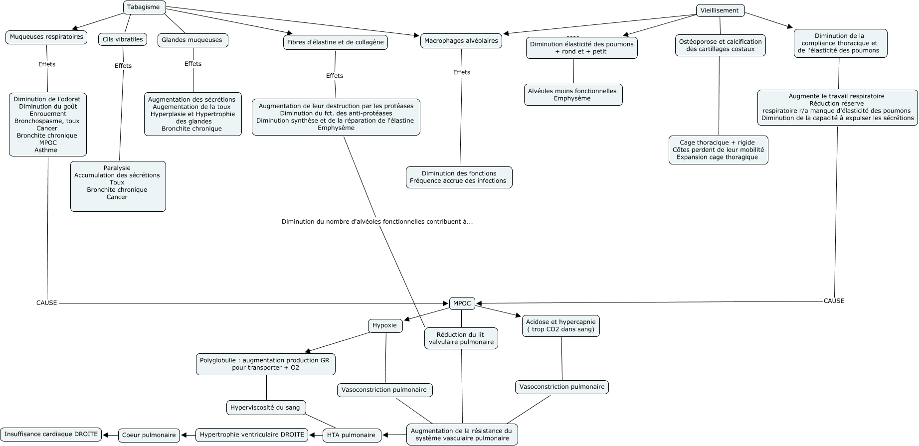 Cette carte de concepts créée avec IHMC CmapTools traite de: MPOC, Cils vibratiles Effets Paralysie Accumulation des sécrétions Toux Bronchite chronique Cancer, Ostéoporose et calcification des cartillages costaux ???? Cage thoracique + rigide Côtes perdent de leur mobilité Expansion cage thoragique, Tabagisme ???? Fibres d'élastine et de collagène, Macrophages alvéolaires Effets Diminution des fonctions Fréquence accrue des infections, Vasoconstriction pulmonaire ???? Augmentation de la résistance du système vasculaire pulmonaire, MPOC ???? Réduction du lit valvulaire pulmonaire, Tabagisme ???? Muqueuses respiratoires, Coeur pulmonaire ???? Insuffisance cardiaque DROITE, Diminution de l'odorat Diminution du goût Enrouement Bronchospasme, toux Cancer Bronchite chronique MPOC Asthme CAUSE MPOC, Vieillisement ???? Diminution de la compliance thoracique et de l'élasticité des poumons, MPOC ???? Acidose et hypercapnie ( trop CO2 dans sang), Vieillisement ???? Macrophages alvéolaires, Muqueuses respiratoires Effets Diminution de l'odorat Diminution du goût Enrouement Bronchospasme, toux Cancer Bronchite chronique MPOC Asthme, Tabagisme ???? Cils vibratiles, Fibres d'élastine et de collagène Effets Augmentation de leur destruction par les protéases Diminution du fct. des anti-protéases Diminution synthèse et de la réparation de l'élastine Emphysème, Hyperviscosité du sang ???? HTA pulmonaire, Tabagisme ???? Macrophages alvéolaires, Glandes muqueuses Effets Augmentation des sécrétions Augementation de la toux Hyperplasie et Hypertrophie des glandes Bronchite chronique, Augmente le travail respiratoire Réduction réserve respiratoire r/a manque d'élasticité des poumons Diminution de la capacité à expulser les sécrétions CAUSE MPOC, Hypertrophie ventriculaire DROITE ???? Coeur pulmonaire