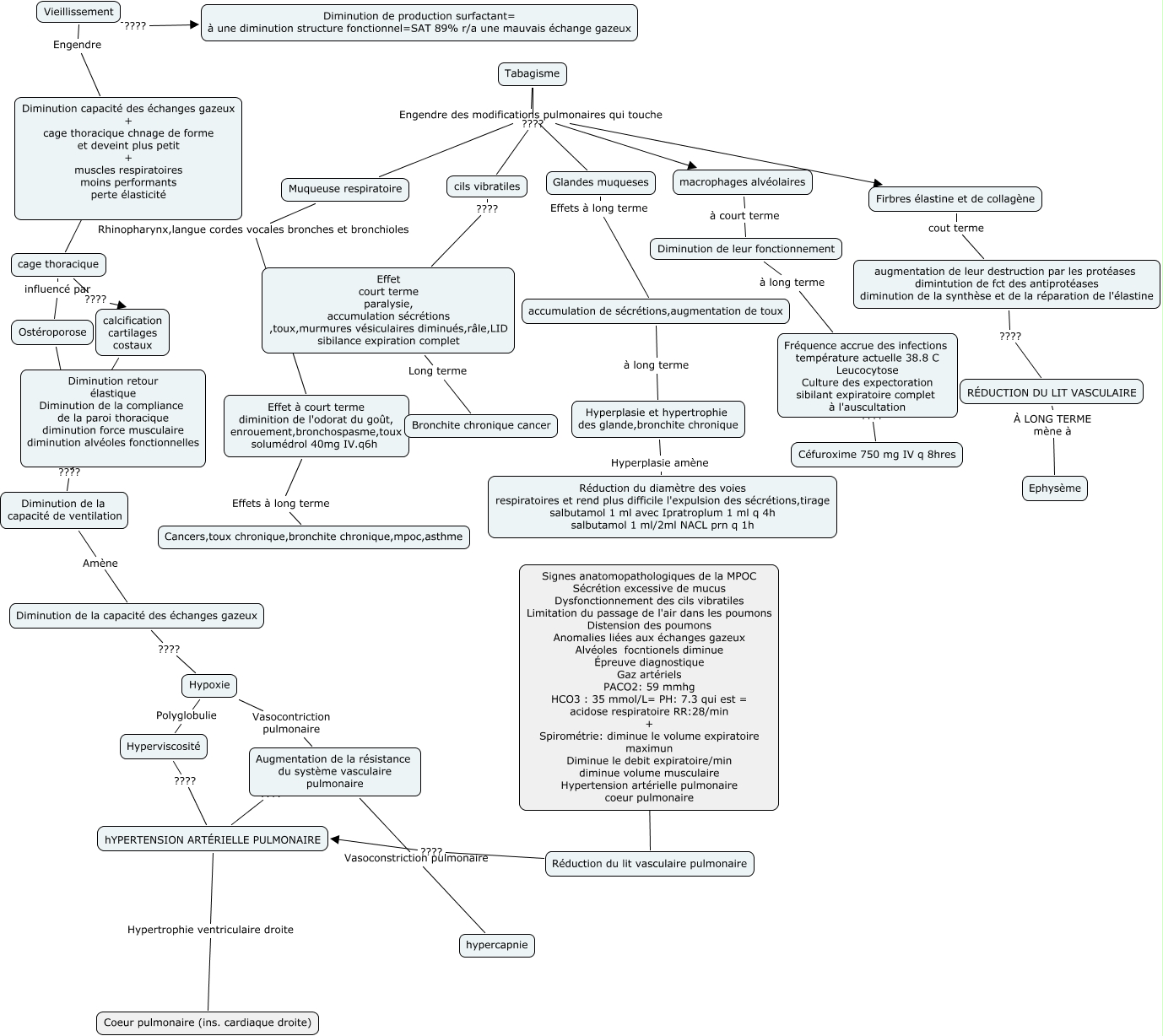 Cette carte de concepts créée avec IHMC CmapTools traite de: MPOC, Tabagisme Engendre des modifications pulmonaires qui touche macrophages alvéolaires, cils vibratiles ???? Effet court terme paralysie, accumulation sécrétions ,toux,murmures vésiculaires diminués,râle,LID sibilance expiration complet, RÉDUCTION DU LIT VASCULAIRE À LONG TERME mène à Ephysème, Diminution de la capacité de ventilation Amène Diminution de la capacité des échanges gazeux, Diminution de la capacité des échanges gazeux ???? Hypoxie, augmentation de leur destruction par les protéases dimintution de fct des antiprotéases diminution de la synthèse et de la réparation de l'élastine ???? RÉDUCTION DU LIT VASCULAIRE, Tabagisme Engendre des modifications pulmonaires qui touche Glandes muqueses, Hyperviscosité ???? hYPERTENSION ARTÉRIELLE PULMONAIRE, Muqueuse respiratoire Rhinopharynx,langue cordes vocales bronches et bronchioles Effet à court terme diminition de l'odorat du goût, enrouement,bronchospasme,toux solumédrol 40mg IV.q6h, Tabagisme ???? cils vibratiles, cage thoracique influencé par Ostéroporose, Hypoxie Vasocontriction pulmonaire Augmentation de la résistance du système vasculaire pulmonaire, Glandes muqueses Effets à long terme accumulation de sécrétions,augmentation de toux, Réduction du lit vasculaire pulmonaire ???? hYPERTENSION ARTÉRIELLE PULMONAIRE, Tabagisme Engendre des modifications pulmonaires qui touche Firbres élastine et de collagène, Augmentation de la résistance du système vasculaire pulmonaire ???? hYPERTENSION ARTÉRIELLE PULMONAIRE, calcification cartilages costaux ???? Diminution retour élastique Diminution de la compliance de la paroi thoracique diminution force musculaire diminution alvéoles fonctionnelles, Hypoxie Polyglobulie Hyperviscosité, Diminution de leur fonctionnement à long terme Fréquence accrue des infections température actuelle 38.8 C Leucocytose Culture des expectoration sibilant expiratoire complet à l'auscultation, Tabagisme Engendre des modifications pulmonaires qui touche Muqueuse respiratoire