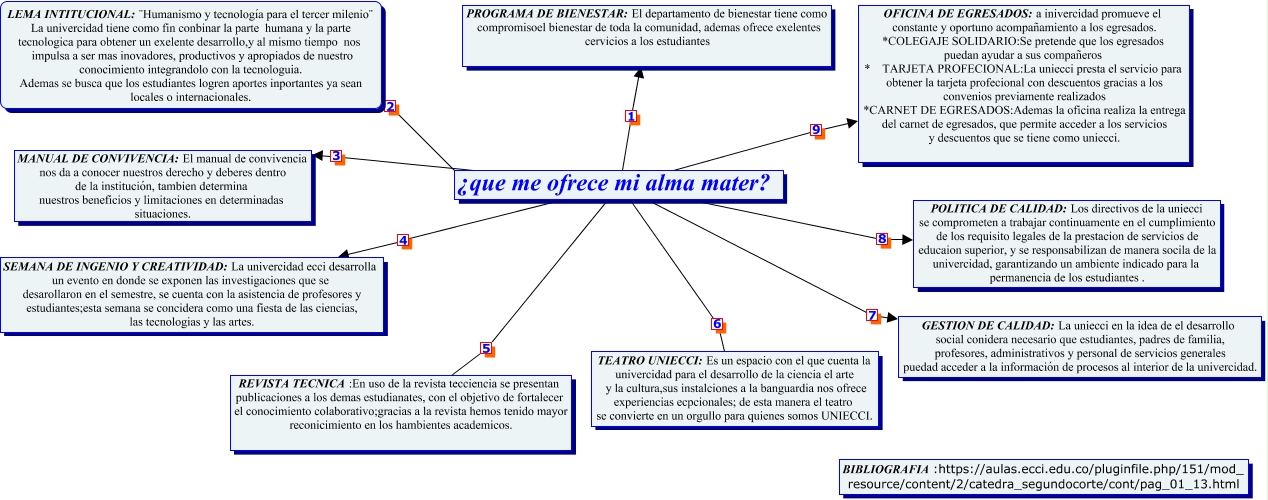 Este Cmap, tiene información relacionada con: alexander catedra ecci, ¿que me ofrece mi alma mater? 1 PROGRAMA DE BIENESTAR:El departamento de bienestar tiene como compromisoel bienestar de toda la comunidad, ademas ofrece exelentes cervicios a los estudiantes, ¿que me ofrece mi alma mater? 8 POLITICA DE CALIDAD:Los directivos de la uniecci se comprometen a trabajar continuamente en el cumplimiento de los requisito legales de la prestacion de servicios de educaion superior, y se responsabilizan de manera socila de la univercidad, garantizando un ambiente indicado para la permanencia de los estudiantes ., ¿que me ofrece mi alma mater? 7 GESTION DE CALIDAD:La uniecci en la idea de el desarrollo social conidera necesario que estudiantes, padres de familia, profesores, administrativos y personal de servicios generales puedad acceder a la información de procesos al interior de la univercidad., ¿que me ofrece mi alma mater? 9 OFICINA DE EGRESADOS:a inivercidad promueve el constante y oportuno acompañamiento a los egresados. *COLEGAJE SOLIDARIO:Se pretende que los egresados puedan ayudar a sus compañeros * TARJETA PROFECIONAL:La uniecci presta el servicio para obtener la tarjeta profecional con descuentos gracias a los convenios previamente realizados *CARNET DE EGRESADOS:Ademas la oficina realiza la entrega del carnet de egresados, que permite acceder a los servicios y descuentos que se tiene como uniecci., ¿que me ofrece mi alma mater? 3 MANUAL DE CONVIVENCIA:El manual de convivencia nos da a conocer nuestros derecho y deberes dentro de la institución, tambien determina nuestros beneficios y limitaciones en determinadas situaciones., LEMA INTITUCIONAL:¨Humanismo y tecnología para el tercer milenio¨ La univercidad tiene como fin conbinar la parte humana y la parte tecnologica para obtener un exelente desarrollo,y al mismo tiempo nos impulsa a ser mas inovadores, productivos y apropiados de nuestro conocimiento integrandolo con la tecnologuia. Ademas se busca que los estudiantes logren aportes inportantes ya sean locales o internacionales. 2 ¿que me ofrece mi alma mater?, ¿que me ofrece mi alma mater? 6 TEATRO UNIECCI:Es un espacio con el que cuenta la univercidad para el desarrollo de la ciencia el arte y la cultura,sus instalciones a la banguardia nos ofrece experiencias ecpcionales; de esta manera el teatro se convierte en un orgullo para quienes somos UNIECCI., ¿que me ofrece mi alma mater? 5 REVISTA TECNICA:En uso de la revista tecciencia se presentan publicaciones a los demas estudianates, con el objetivo de fortalecer el conocimiento colaborativo;gracias a la revista hemos tenido mayor reconicimiento en los hambientes academicos., ¿que me ofrece mi alma mater? 4 SEMANA DE INGENIO Y CREATIVIDAD:La univercidad ecci desarrolla un evento en donde se exponen las investigaciones que se desarollaron en el semestre, se cuenta con la asistencia de profesores y estudiantes;esta semana se concidera como una fiesta de las ciencias, las tecnologias y las artes.
