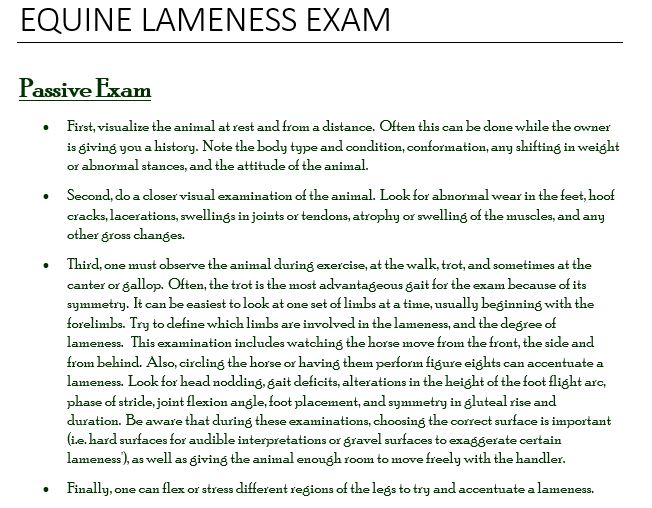 This Concept Map, created with IHMC CmapTools, has information related to: Elements of a Lameness Exam, Elements of a Lameness Exam include Equipment, Elements of a Lameness Exam include Passive Examination, Elements of a Lameness Exam include Diagnositc Tests (Scroll over), Elements of a Lameness Exam include Active Examination