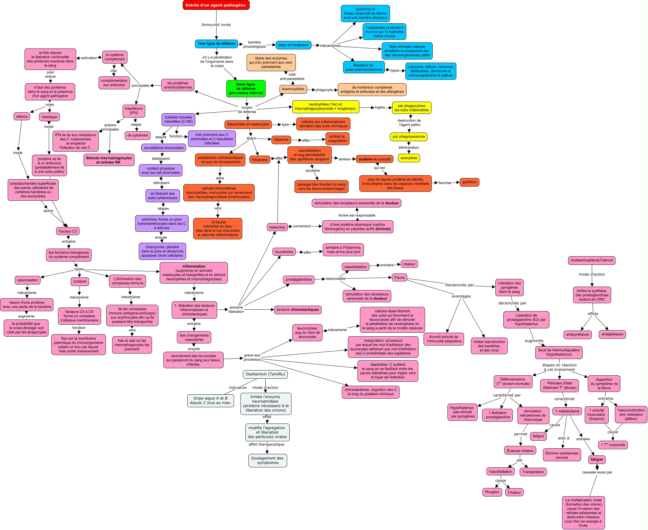 Cette carte de concepts créée avec IHMC CmapTools traite de: virus et syst immunitaire, héparine effet inhibite la coagulation, Évacuer chaleur par Vasodilatation, 2ème ligne de défense (processus interne) moyen de défense Cellules tueuses naturelles (C NK), Cellules tueuses naturelles (C NK) fonction s'en prennent aux C anormales et C tissulaires infectées, Interférons (IFN) classe de cytokines, Périodes d'état (Matinent T° élevée) caractérisé ↑ métabolisme, facteurs C5 à C9 forme un complexe d'attaque membranaire fonction fixe sur la membrane plasmique du microorganisme créant un trou par lequel l'eau entre massivement, Oseltamivir (Tamiflu) indication Gripe aigue A et B depuis 2 Jous au max., il faut des protéines dans le sang et la présence d'un agent pathogène voies alterne, en libérant des subs cytotoxiques étapes perforine: forme un pore transmembranaire dans les C à détruire, prostaglandines responsable stimulation des récepteurs sensoriels de la douleur, Vasodilatation cause Rougeur, Évacuer chaleur par Transpiration, histamine conversion d'une protéine plasmique inactive (kininogène) en peptides actifs (kinines), Basophiles et mastocytes type cellules pro-inflammatoires sécrétant des subs chimiques, Libération de prostaglandine (E2) par hypothalamus augmente Seuil de thermorégulation (hypothalamus), Apparition du symptôme de la fièvre entraîne ↑ activité musculaire (frissons), vasodilatation et aug perméabilité des capillaires sanguins accélère passage des liquides du sang vers les tissus endommagés, il faut des protéines dans le sang et la présence d'un agent pathogène voies classique, Inhibe l'enzyme neuroamidase (proteine nécessaire à la liberation des virions) effet modifie l'agregation et liberation des particules virales