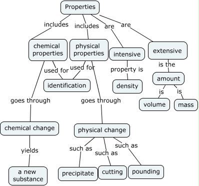 This Concept Map, created with IHMC CmapTools, has information related to: properties cmap, physical change such as cutting, chemical properties goes through chemical change, Properties are intensive, chemical change yields a new substance, intensive property is density, extensive is the amount, Properties are extensive, Properties includes physical properties, physical properties used for identification, chemical properties used for identification, physical properties goes through physical change, physical change such as pounding, amount is volume, amount is mass, Properties includes chemical properties, physical change such as precipitate
