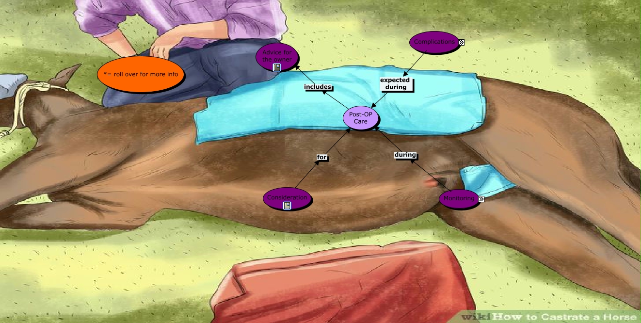 This Concept Map, created with IHMC CmapTools, has information related to: Post-OP, Monitoring includes knowing about Myiasis and flies*, Consideration for Post-OP Care, Complications Include Oedema*, Monitoring includes knowing about Cleanliness of the Stable*, Complications expected during Post-OP Care, Post-OP Care includes Advice for the owner, Complications Include Eventration*, Complications Include Infection*, Complications Include Haemorrhage*, Monitoring includes knowing about When to call the vet*, Complications Include Hydrocoele*, Complications Include Persistent Stallion-like Behaviour*, Monitoring during Post-OP Care