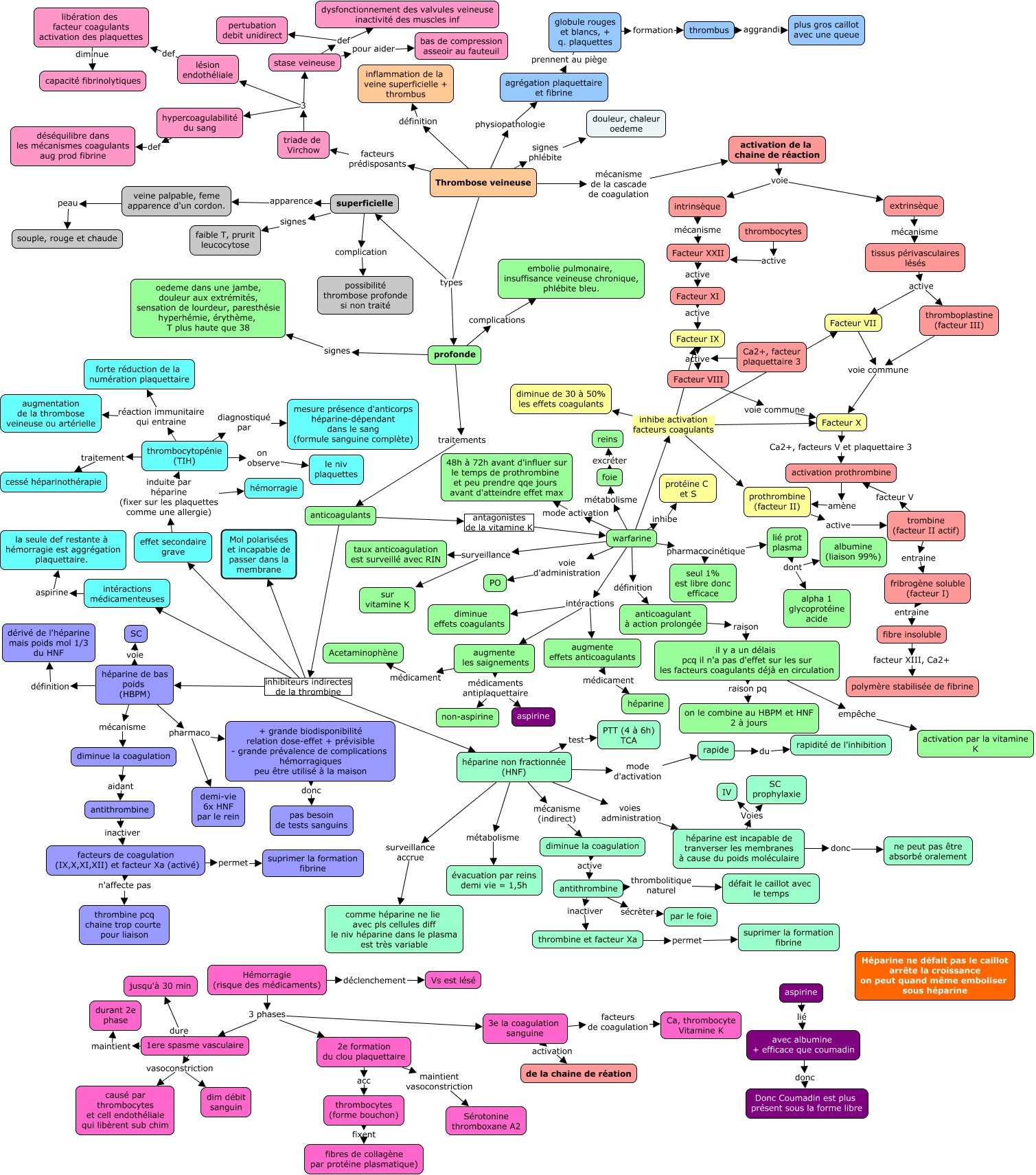 This Concept Map, created with IHMC CmapTools, has information related to: thrombose veineuse, augmente les saignements médicaments antiplaquettaire non-aspirine, thrombocytopénie (TIH) diagnostiqué par mesure présence d'anticorps héparine-dépendant dans le sang (formule sanguine complète), warfarine intéractions diminue effets coagulants, warfarine intéractions augmente effets anticoagulants, intrinsèque mécanisme Facteur XXII, tissus périvasculaires lésés active thromboplastine (facteur III), Hémorragie (risque des médicaments) 3 phases 1ere spasme vasculaire, thrombine et facteur Xa permet suprimer la formation fibrine, héparine non fractionnée (HNF) voies administration héparine est incapable de tranverser les membranes à cause du poids moléculaire, héparine de bas poids (HBPM) voie SC, lié prot plasma dont albumine (liaison 99%), 2e formation du clou plaquettaire maintient vasoconstriction Sérotonine thromboxane A2, héparine non fractionnée (HNF) mécanisme (indirect) diminue la coagulation, héparine est incapable de tranverser les membranes à cause du poids moléculaire Voies IV, Facteur XXII active Facteur XI, anticoagulant à action prolongée raison il y a un délais pcq il n'a pas d'effet sur les sur les facteurs coagulants déjà en circulation, héparine est incapable de tranverser les membranes à cause du poids moléculaire Voies SC prophylaxie, thrombus aggrandi plus gros caillot avec une queue, Facteur VIII voie commune Facteur X, augmente effets anticoagulants médicament héparine