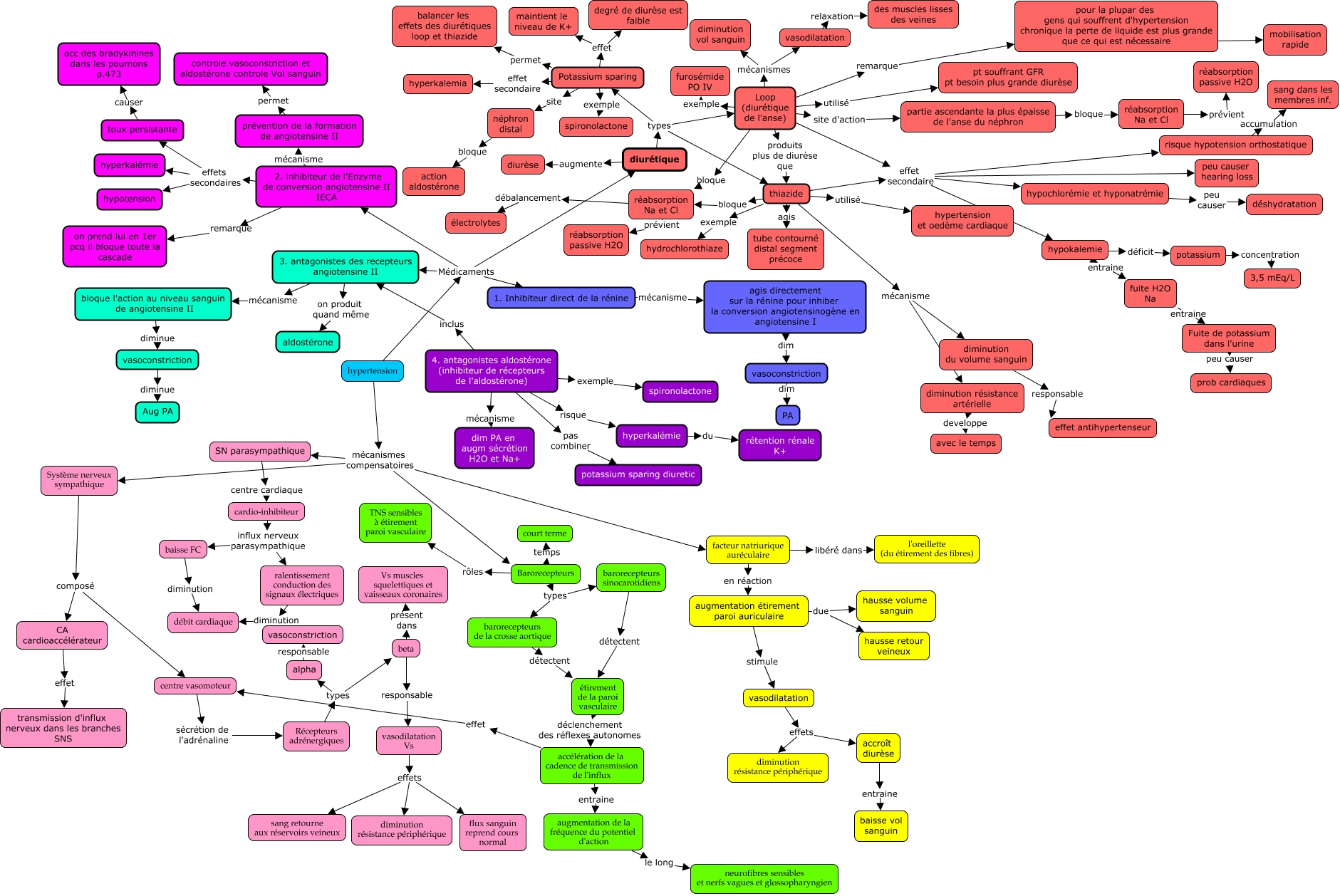 This Concept Map, created with IHMC CmapTools, has information related to: hypertension + med, Potassium sparing effet secondaire hyperkalemia, Loop (diurétique de l'anse) exemple furosémide PO IV, augmentation étirement paroi auriculaire stimule vasodilatation, vasodilatation effets diminution résistance périphérique, 3. antagonistes des recepteurs angiotensine II mécanisme bloque l'action au niveau sanguin de angiotensine II, Loop (diurétique de l'anse) mécanismes vasodilatation, 4. antagonistes aldostérone (inhibiteur de récepteurs de l'aldostérone) exemple spironolactone, thiazide effet secondaire risque hypotension orthostatique, thiazide mécanisme diminution résistance artérielle, toux persistante causer acc des bradykinines dans les poumons p.473, Loop (diurétique de l'anse) site d'action partie ascendante la plus épaisse de l'anse du néphron, Loop (diurétique de l'anse) effet secondaire risque hypotension orthostatique, centre vasomoteur sécrétion de l'adrénaline Récepteurs adrénergiques, 4. antagonistes aldostérone (inhibiteur de récepteurs de l'aldostérone) mécanisme dim PA en augm sécrétion H2O et Na+, baisse FC diminution débit cardiaque, diminution résistance artérielle developpe avec le temps, partie ascendante la plus épaisse de l'anse du néphron bloque réabsorption Na et Cl, vasodilatation Vs effets sang retourne aux réservoirs veineux, 4. antagonistes aldostérone (inhibiteur de récepteurs de l'aldostérone) pas combiner potassium sparing diuretic, hyperkalémie du rétention rénale K+