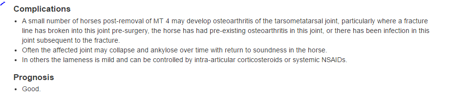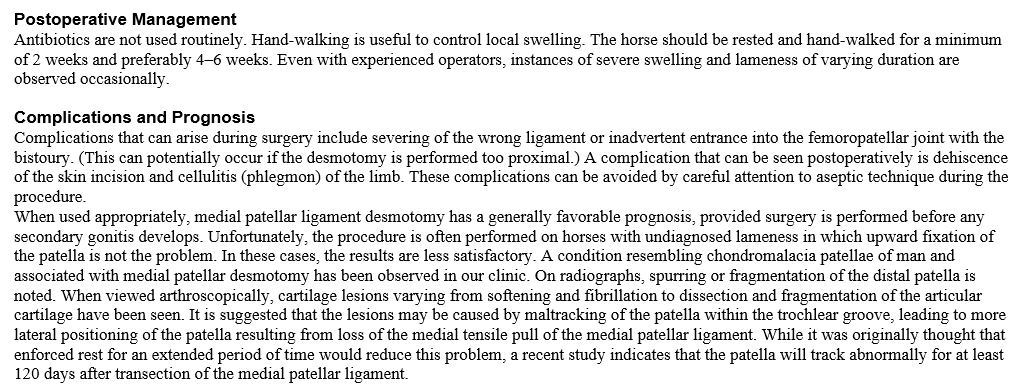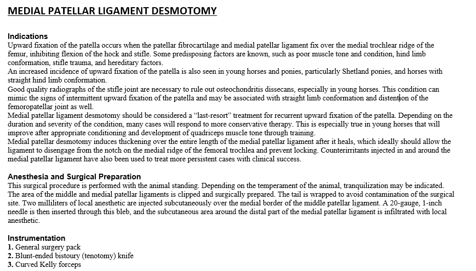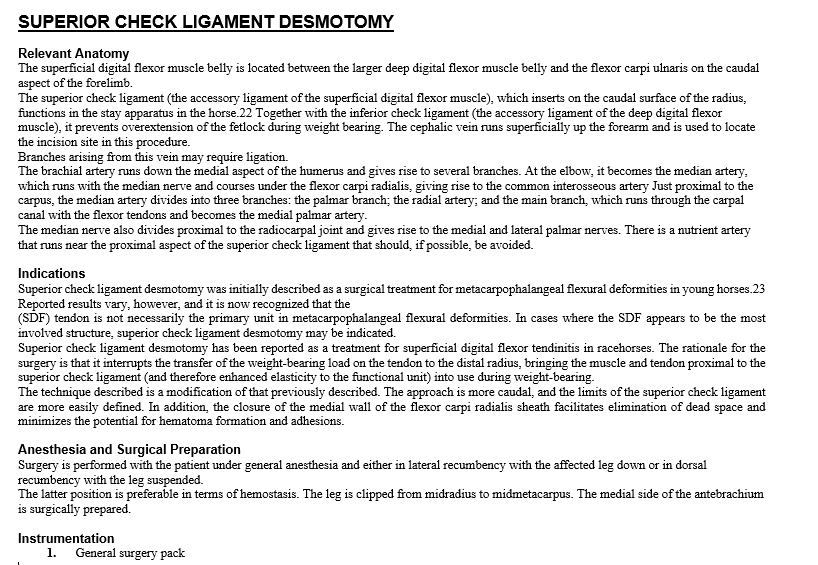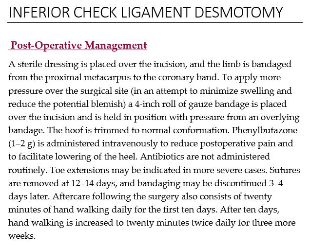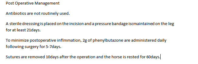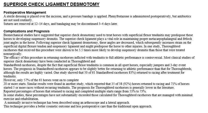 Procedure Cmaps Adv+Disadv.PNG Adv+dis palmar.PNG Before and after surgery (DDFT).JPG Before and after surgery (ICLD).JPG Cast.JPG check ligament anatomy.png Deep digital flexor tendon anatomy.jpg Deep digital flexor Tenotomy Procedure.docx Drugs for splint bone.PNG Fracture location & Prognosis.PNG fracture stablilization.PNG General info.PNG horse fracture stabilation.jpg Inferior Check Ligament Desmotomy procedure.JPG Inferior Check Ligament Desmotomy Procedure.docx Inferior Check Ligament Desmotomy Video.url leg-anatomy.jpg Materials.PNG Materials for bandaing.PNG medial patellar desmotomy.PNG medial patellar desmotomy intra po.PNG medial patellar desmotomy PO.PNG medial patellar desmotomy Postop.PNG NANRIC - Deep Flexor Tenotomy.mp4 palmar digi po.PNG Palmar digital neurectomy.url palmar prognosis and complications.PNG Post Op After care.JPG primary Layer.PNG primary Layer for bandaging.PNG Robert Jones Bandage.JPG Robert Jones with Splint.JPG Secondary layer.PNG Secondary layer for bandaging.PNG splint bone.PNG Splint bone anatomy.jpg Splint bone Caudal View.gif Splint bone PO.PNG Step 1.PNG Step 2.PNG Step 3.PNG Step 4.PNG Step 5.PNG Step 6.PNG Step 7.PNG Step 8.PNG Step 9.PNG superior check lig desmotomy.PNG superior check lig desmotomy intra op.PNG superior check lig desmotomy per op.PNG superior check lig desmotomy post op.PNG Tertiary Layer for bandaging.PNG Types of Equine Bandages.docx