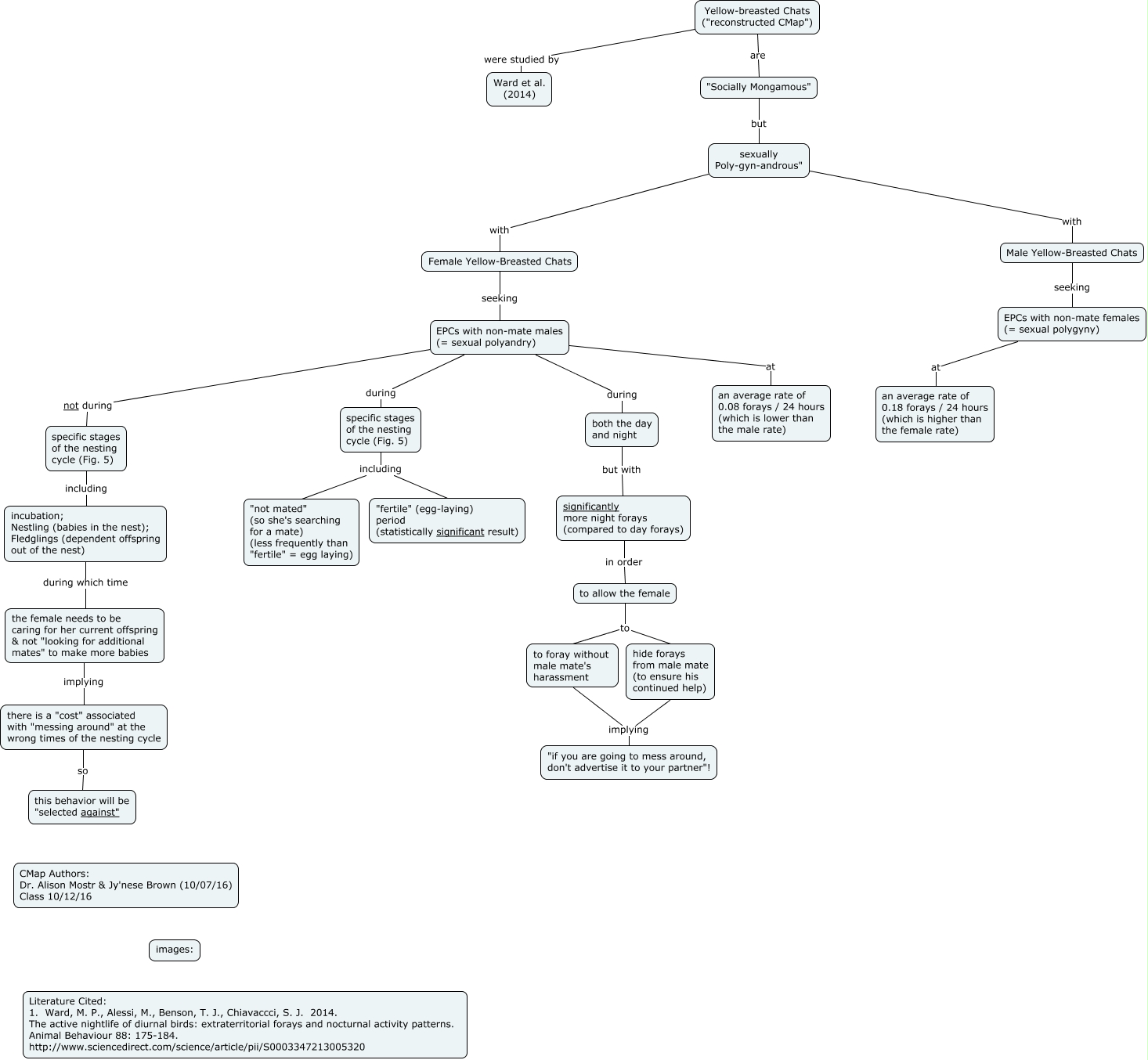 This Concept Map, created with IHMC CmapTools, has information related to: Yellow-Breasted CMap 100716 backup, incubation; Nestling (babies in the nest); Fledglings (dependent offspring out of the nest) during which time the female needs to be caring for her current offspring & not "looking for additional mates" to make more babies, to allow the female to hide forays from male mate (to ensure his continued help), EPCs with non-mate males (= sexual polyandry) at an average rate of 0.08 forays / 24 hours (which is lower than the male rate), Yellow-breasted Chats ("reconstructed CMap") were studied by Ward et al. (2014), EPCs with non-mate males (= sexual polyandry) not during specific stages of the nesting cycle (Fig. 5), specific stages of the nesting cycle (Fig. 5) including incubation; Nestling (babies in the nest); Fledglings (dependent offspring out of the nest), significantly more night forays (compared to day forays) in order to allow the female, sexually Poly-gyn-androus" with Female Yellow-Breasted Chats, "Socially Mongamous" but sexually Poly-gyn-androus", hide forays from male mate (to ensure his continued help) implying to foray without male mate's harassment, hide forays from male mate (to ensure his continued help) implying "if you are going to mess around, don't advertise it to your partner"!, specific stages of the nesting cycle (Fig. 5) including "not mated" (so she's searching for a mate) (less frequently than "fertile" = egg laying), Yellow-breasted Chats ("reconstructed CMap") are "Socially Mongamous", to allow the female to to foray without male mate's harassment, EPCs with non-mate females (= sexual polygyny) at an average rate of 0.18 forays / 24 hours (which is higher than the female rate), specific stages of the nesting cycle (Fig. 5) including "fertile" (egg-laying) period (statistically significant result), EPCs with non-mate males (= sexual polyandry) during specific stages of the nesting cycle (Fig. 5), Female Yellow-Breasted Chats seeking EPCs with non-mate males (= sexual polyandry), sexually Poly-gyn-androus" with Male Yellow-Breasted Chats, the female needs to be caring for her current offspring & not "looking for additional mates" to make more babies implying there is a "cost" associated with "messing around" at the wrong times of the nesting cycle