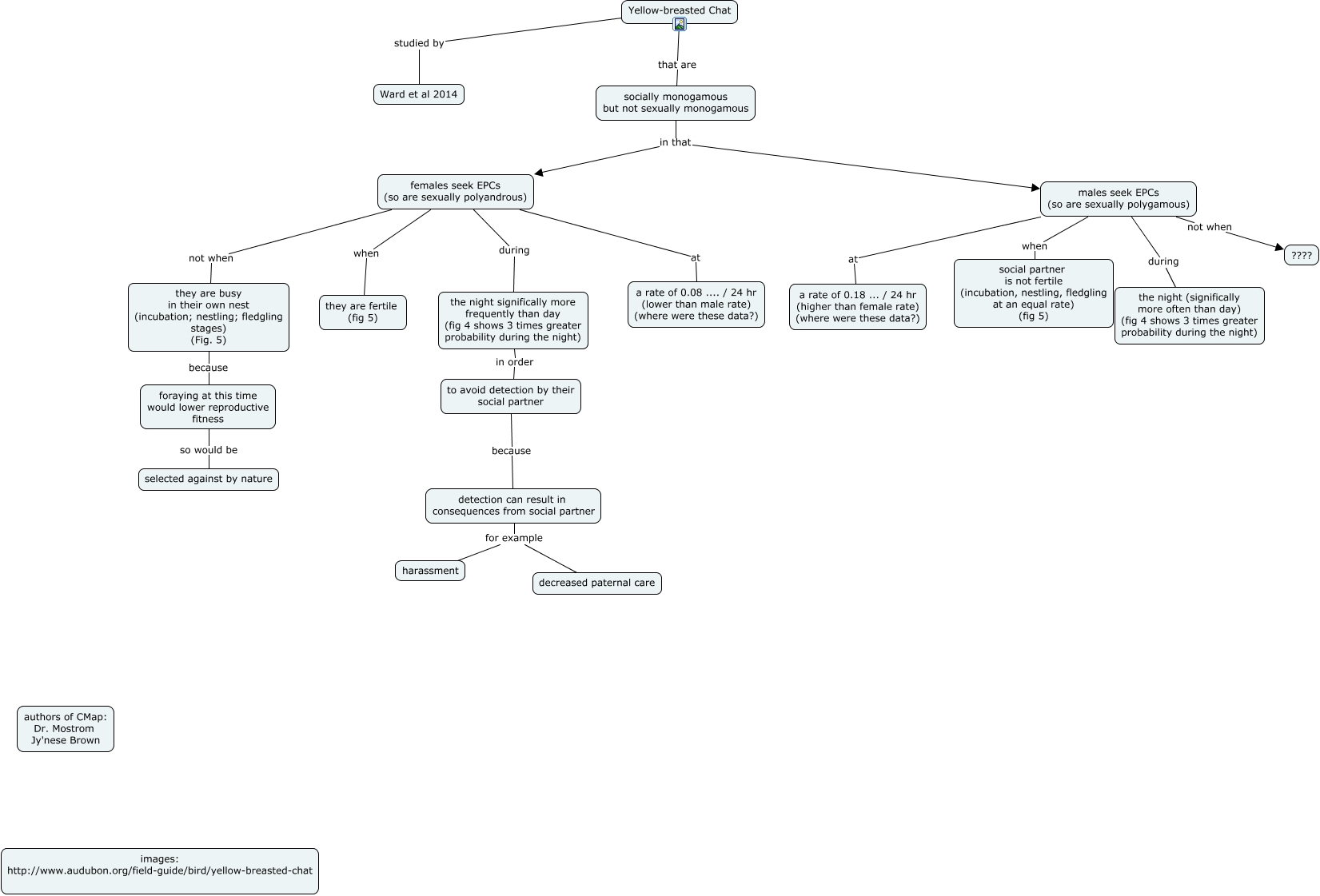 This Concept Map, created with IHMC CmapTools, has information related to: Yellow Breasted Chat 100716, socially monogamous but not sexually monogamous in that males seek EPCs (so are sexually polygamous), detection can result in consequences from social partner for example harassment, females seek EPCs (so are sexually polyandrous) during the night significally more frequently than day (fig 4 shows 3 times greater probability during the night), males seek EPCs (so are sexually polygamous) when social partner is not fertile (incubation, nestling, fledgling at an equal rate) (fig 5), males seek EPCs (so are sexually polygamous) at a rate of 0.18 ... / 24 hr (higher than female rate) (where were these data?), Yellow-breasted Chat studied by Ward et al 2014, detection can result in consequences from social partner for example decreased paternal care, females seek EPCs (so are sexually polyandrous) at a rate of 0.08 .... / 24 hr (lower than male rate) (where were these data?), Yellow-breasted Chat that are socially monogamous but not sexually monogamous, the night significally more frequently than day (fig 4 shows 3 times greater probability during the night) in order to avoid detection by their social partner, females seek EPCs (so are sexually polyandrous) not when they are busy in their own nest (incubation; nestling; fledgling stages) (Fig. 5), socially monogamous but not sexually monogamous in that females seek EPCs (so are sexually polyandrous), foraying at this time would lower reproductive fitness so would be selected against by nature, they are busy in their own nest (incubation; nestling; fledgling stages) (Fig. 5) because foraying at this time would lower reproductive fitness, males seek EPCs (so are sexually polygamous) during the night (significally more often than day) (fig 4 shows 3 times greater probability during the night), males seek EPCs (so are sexually polygamous) not when ????, to avoid detection by their social partner because detection can result in consequences from social partner, females seek EPCs (so are sexually polyandrous) when they are fertile (fig 5)
