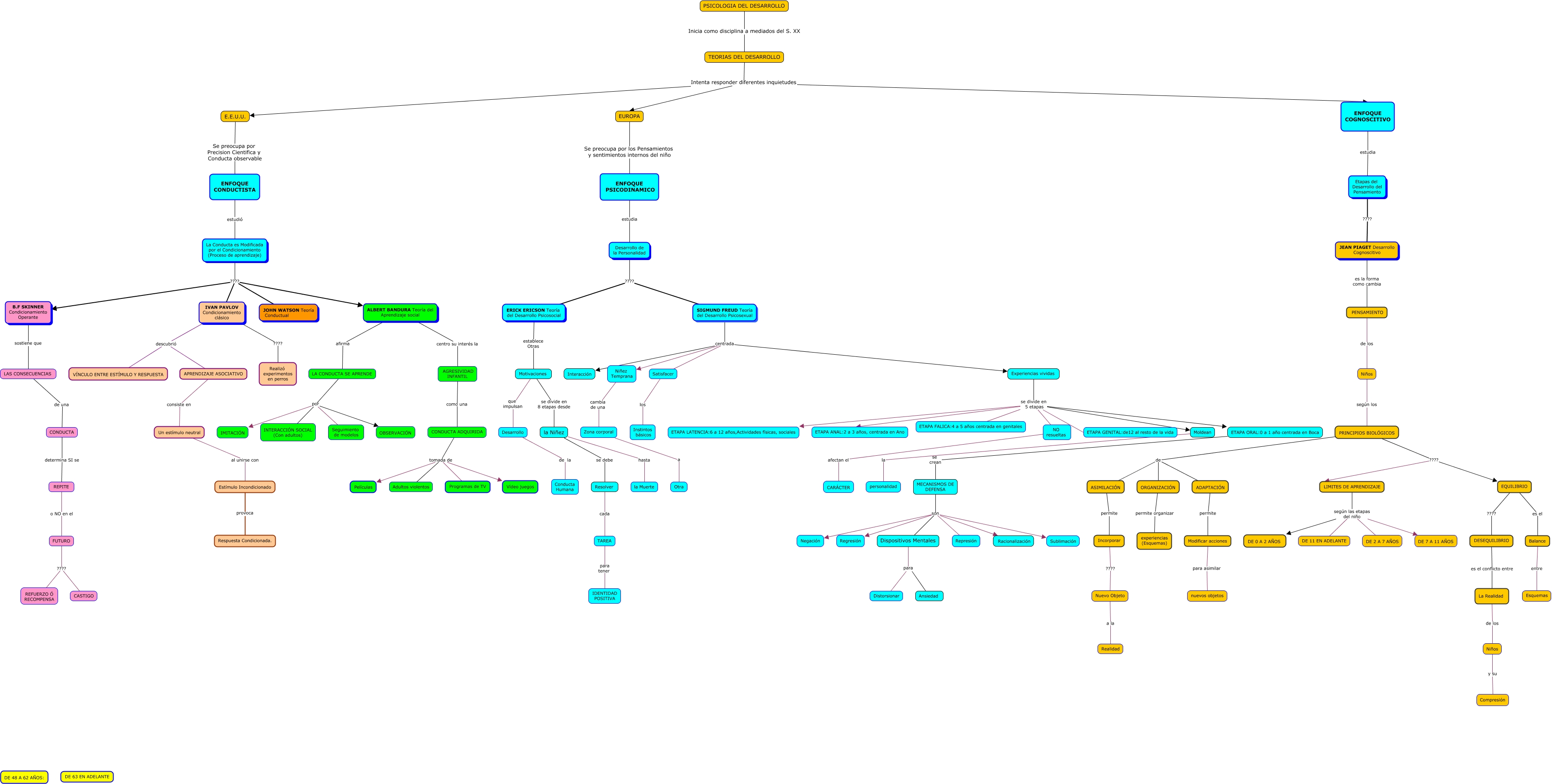 Este Cmap, tiene información relacionada con: PSICOLOGIA - TEORIAS DEL APRENDIZAJE, Desarrollo de la Conducta Humana, La Conducta es Modificada por el Condicionamiento (Proceso de aprendizaje) ???? IVAN PAVLOV Condicionamiento clásico, Experiencias vividas se divide en 5 etapas NO resueltas, MECANISMOS DE DEFENSA son Racionalización, CONDUCTA ADQUIRIDA tomada de Películas, PENSAMIENTO de los Niños, APRENDIZAJE ASOCIATIVO consiste en Un estímulo neutral, NO resueltas afectan el CARÁCTER, EUROPA Se preocupa por los Pensamientos y sentimientos internos del niño ENFOQUE PSICODINAMICO, LA CONDUCTA SE APRENDE por IMITACIÓN, ALBERT BANDURA Teoría del Aprendizaje social centro su interés la AGRESIVIDAD INFANTIL, Moldean la personalidad, PRINCIPIOS BIOLÓGICOS ???? LIMITES DE APRENDIZAJE, Desarrollo de la Personalidad ???? ERICK ERICSON Teoría del Desarrollo Psicosocial, ALBERT BANDURA Teoría del Aprendizaje social afirma LA CONDUCTA SE APRENDE, PRINCIPIOS BIOLÓGICOS de ASIMILACIÓN, Experiencias vividas se divide en 5 etapas ETAPA ORAL:0 a 1 año centrada en Boca, Balance entre Esquemas, Niñez Temprana cambia de una Zona corporal, DESEQUILIBRIO es el conflicto entre La Realidad