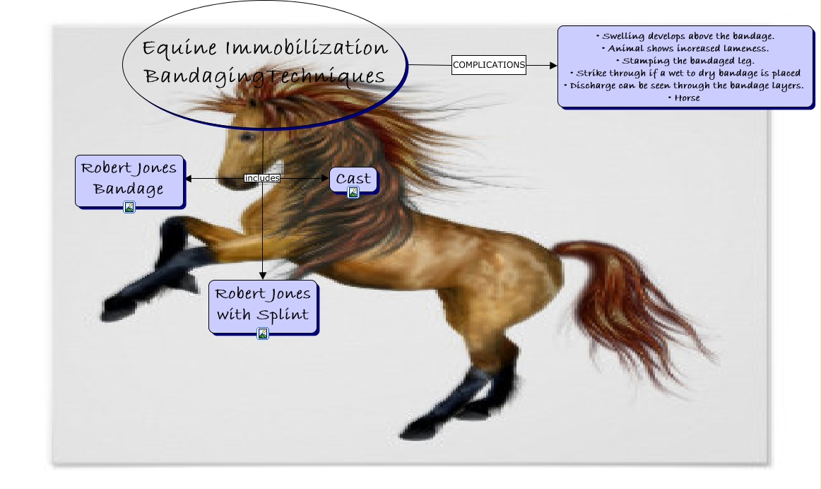 This Concept Map, created with IHMC CmapTools, has information related to: Bandaging, Equine Immobilization BandagingTechniques COMPLICATIONS • Swelling develops above the bandage. • Animal shows increased lameness. • Stamping the bandaged leg. • Strike through if a wet to dry bandage is placed • Discharge can be seen through the bandage layers. • Horse, Equine Immobilization BandagingTechniques includes Robert Jones Bandage, Equine Immobilization BandagingTechniques includes Cast, Equine Immobilization BandagingTechniques includes Robert Jones with Splint