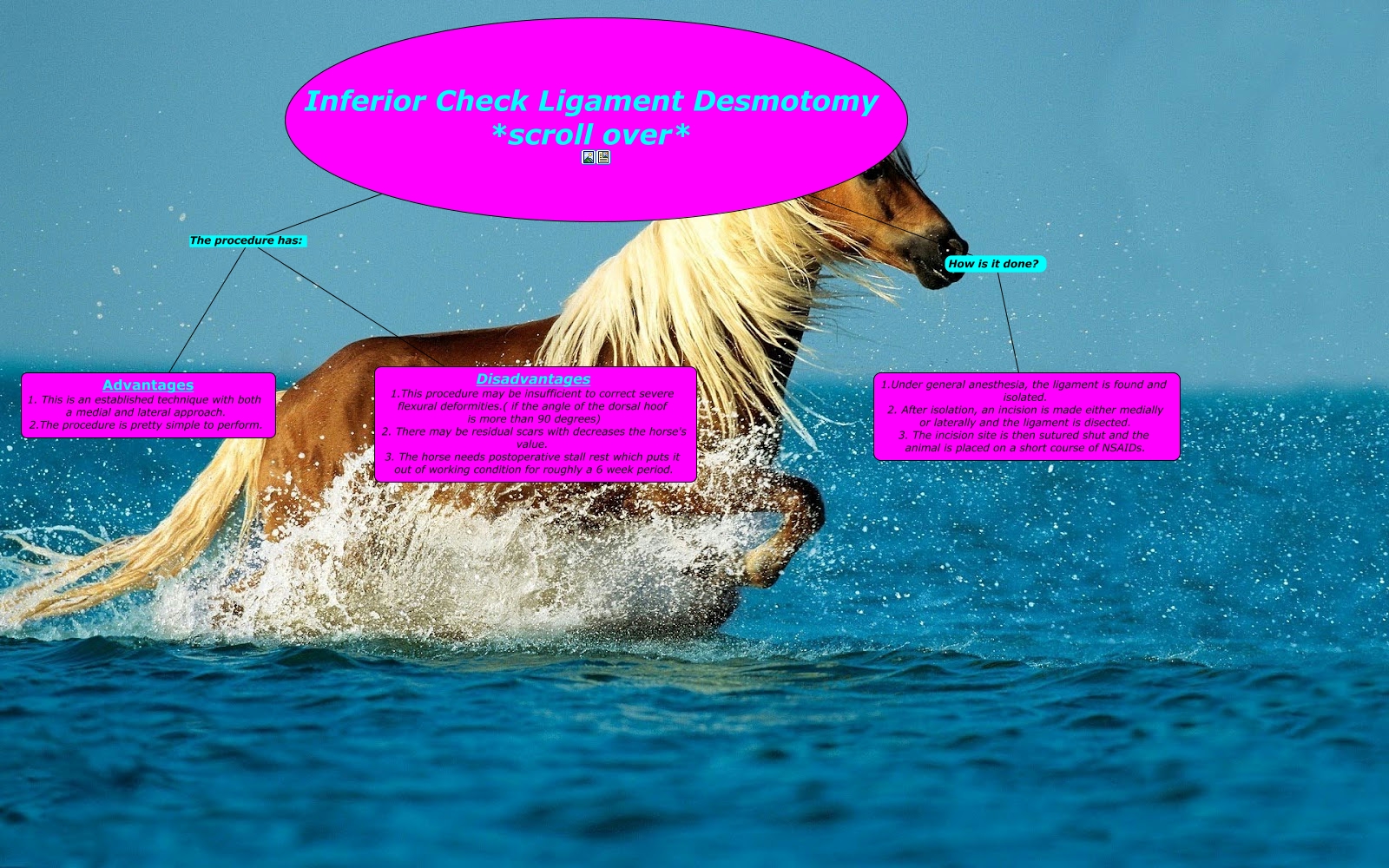 This Concept Map, created with IHMC CmapTools, has information related to: Inferior check ligament, Inferior Check Ligament Desmotomy *scroll over* How is it done? 1.Under general anesthesia, the ligament is found and isolated. 2. After isolation, an incision is made either medially or laterally and the ligament is disected. 3. The incision site is then sutured shut and the animal is placed on a short course of NSAIDs., Inferior Check Ligament Desmotomy *scroll over* The procedure has: Disadvantages 1.This procedure may be insufficient to correct severe flexural deformities.( if the angle of the dorsal hoof is more than 90 degrees) 2. There may be residual scars with decreases the horse's value. 3. The horse needs postoperative stall rest which puts it out of working condition for roughly a 6 week period., Inferior Check Ligament Desmotomy *scroll over* The procedure has: Advantages 1. This is an established technique with both a medial and lateral approach. 2.The procedure is pretty simple to perform.