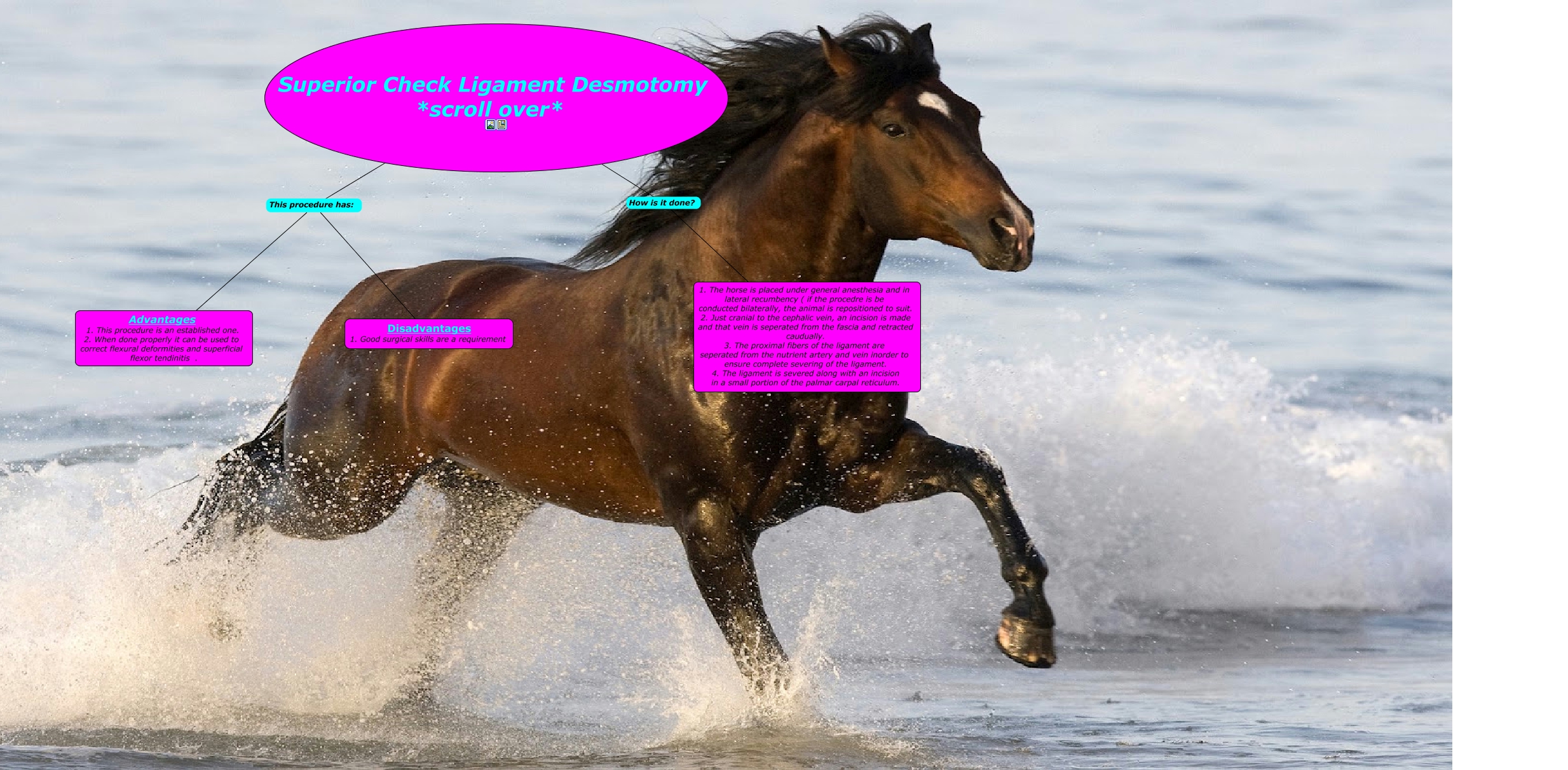 This Concept Map, created with IHMC CmapTools, has information related to: Superior check ligament, Superior Check Ligament Desmotomy *scroll over* How is it done? 1. The horse is placed under general anesthesia and in lateral recumbency ( if the procedre is be conducted bilaterally, the animal is repositioned to suit. 2. Just cranial to the cephalic vein, an incision is made and that vein is seperated from the fascia and retracted caudually. 3. The proximal fibers of the ligament are seperated from the nutrient artery and vein inorder to ensure complete severing of the ligament. 4. The ligament is severed along with an incision in a small portion of the palmar carpal reticulum., Superior Check Ligament Desmotomy *scroll over* This procedure has: Disadvantages 1. Good surgical skills are a requirement, Superior Check Ligament Desmotomy *scroll over* This procedure has: Advantages 1. This procedure is an established one. 2. When done properly it can be used to correct flexural deformities and superficial flexor tendinitis .